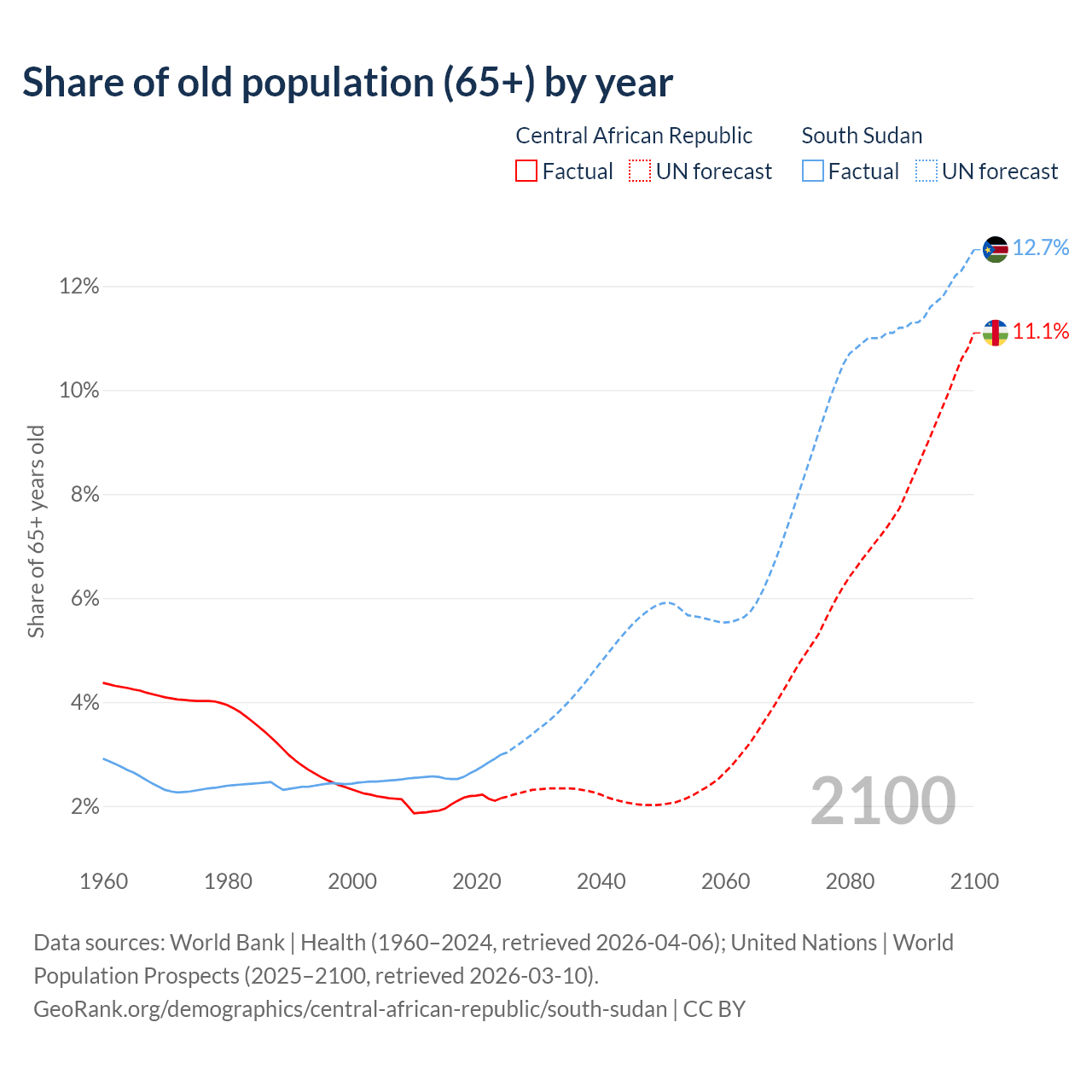 - The share of old-age demographic (65+) in the Central African Republic is 2.15% vs 2.99% in South Sudan.