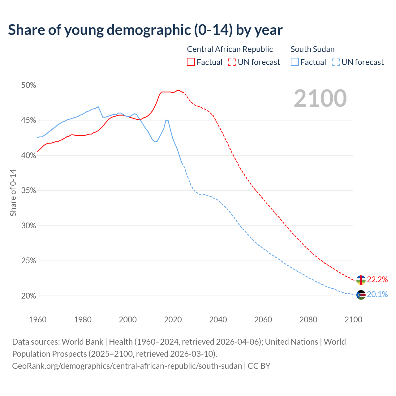- The share of young demographic (0-15 years old) in the Central African Republic is 49% vs 38.9% in South Sudan.