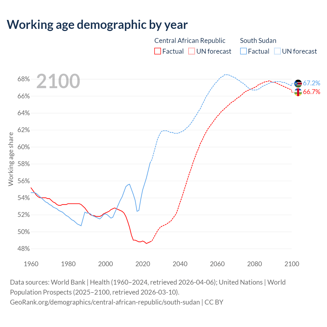 - The Central African Republic has 2.81M working age adults (aged 15-64) vs 7.27M in South Sudan.