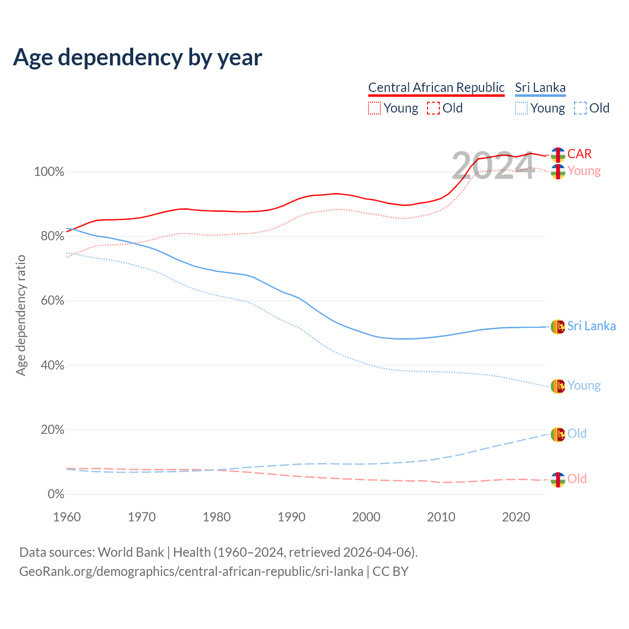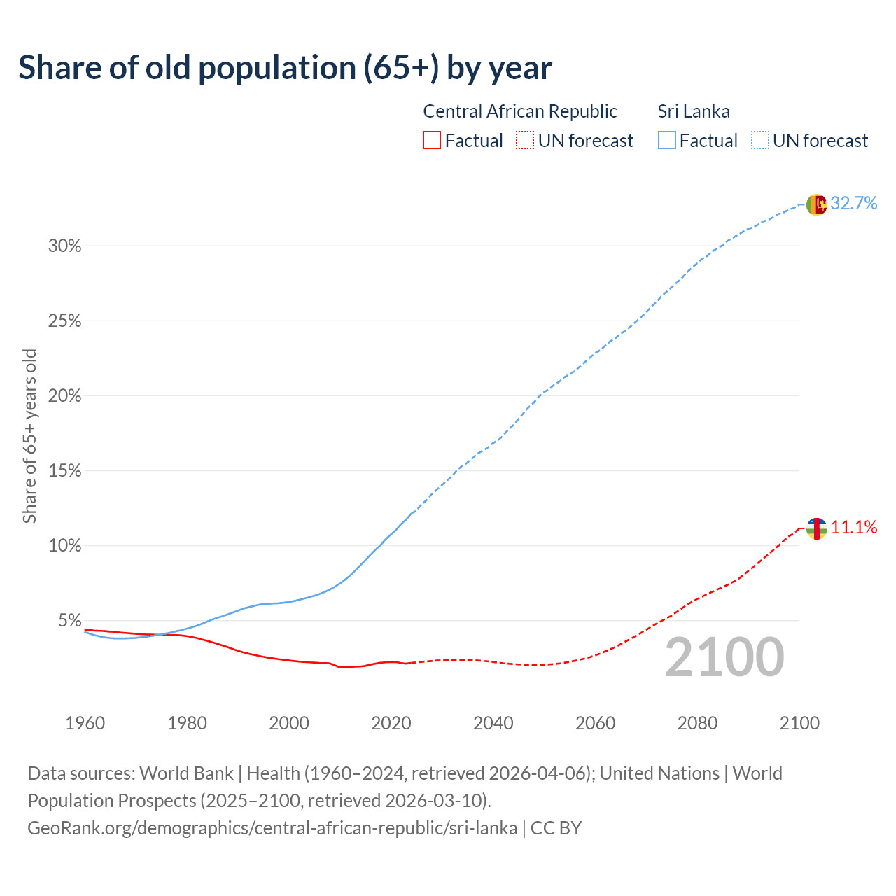 - The share of old-age demographic (65+) in the Central African Republic is 2.15% vs 12.1% in Sri Lanka.