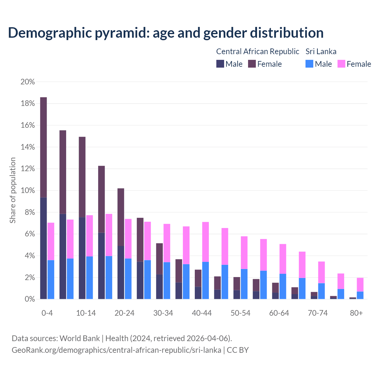 - The Central African Republic is ranked 196/196 by median age (oldest to youngest) vs 81/196 for Sri Lanka.