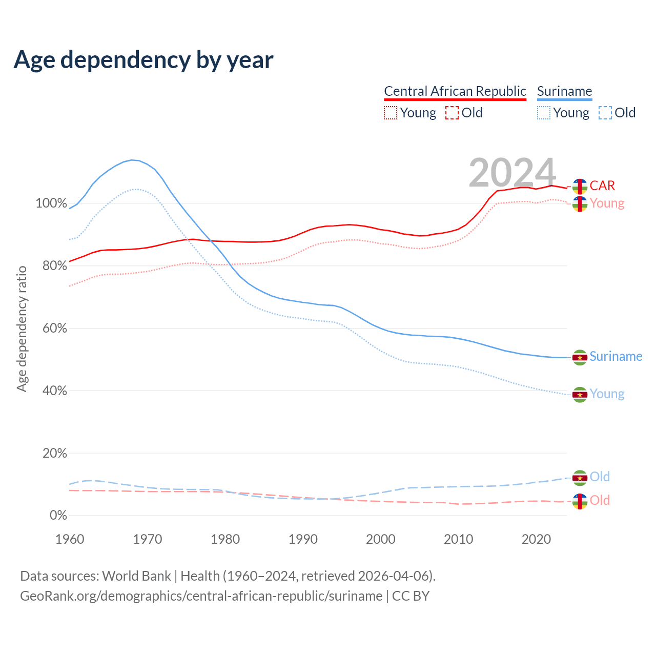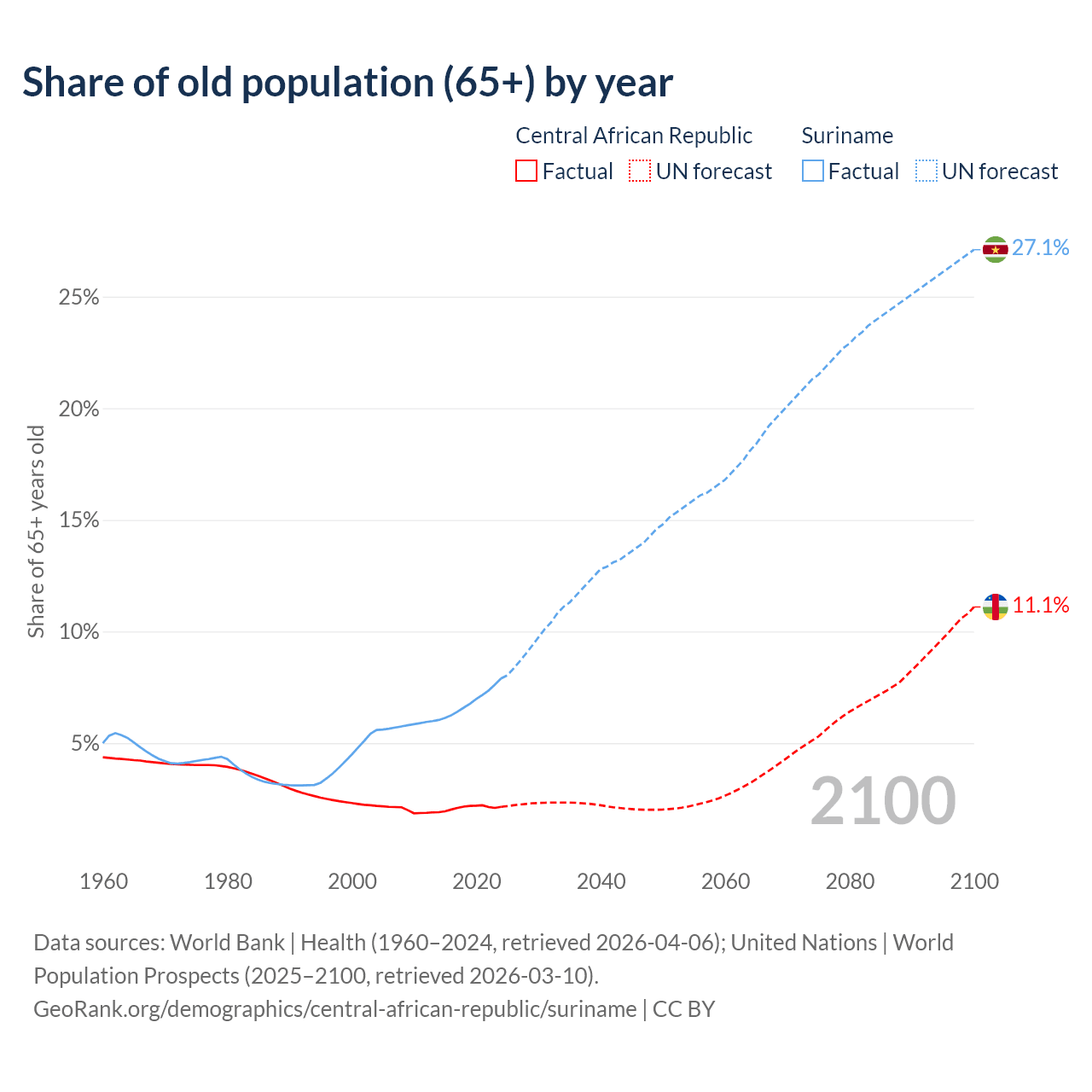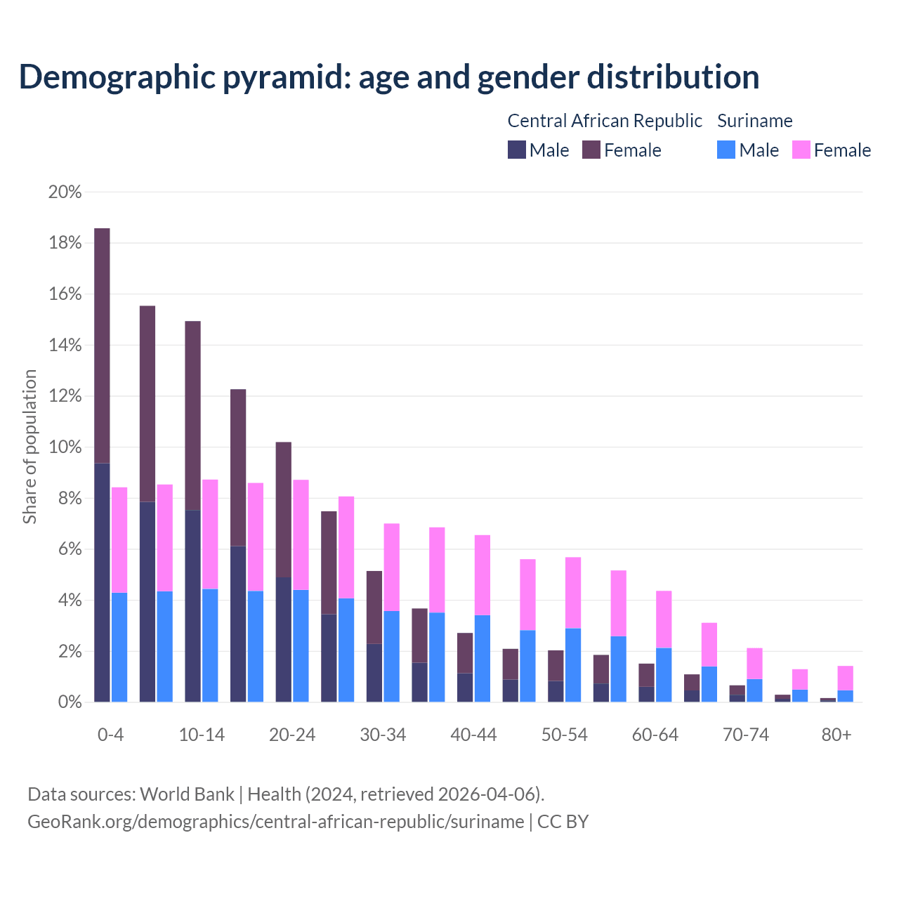 - The share of old-age demographic (65+) in the Central African Republic is 2.15% vs 7.9% in Suriname.