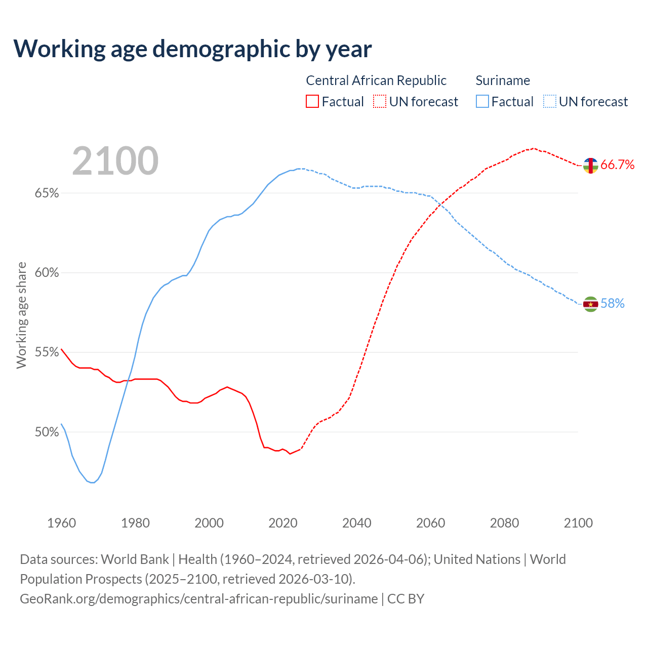 The share of older people aged 65 and over is 2.15% in the Central African Republic and 7.9% in Suriname. Life expectancy in the Central African Republic compared to Suriname .