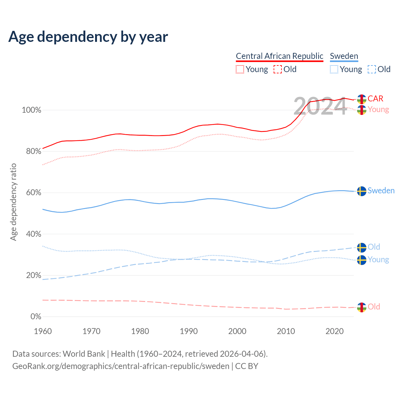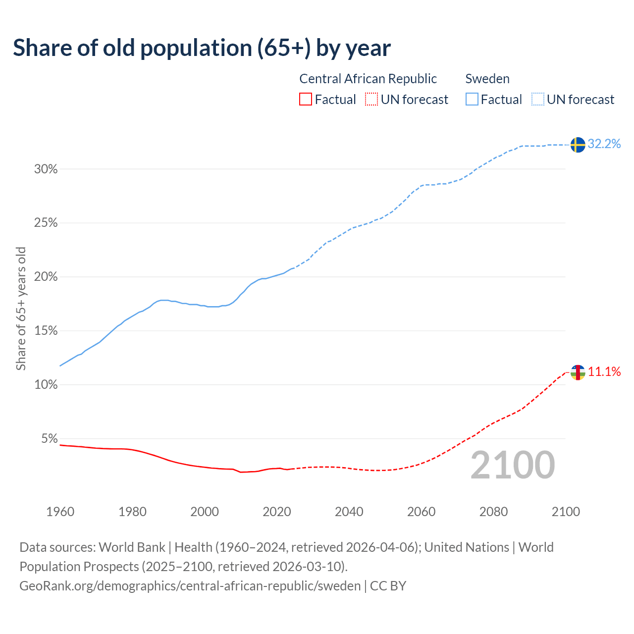 - The share of old-age demographic (65+) in the Central African Republic is 2.15% vs 20.7% in Sweden.
