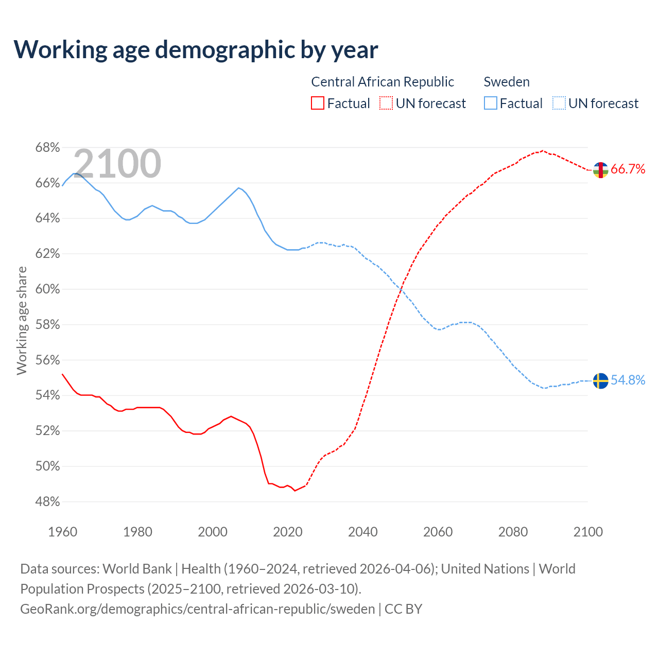 - The Central African Republic has 2.81M working age adults (aged 15-64) vs 6.65M in Sweden.