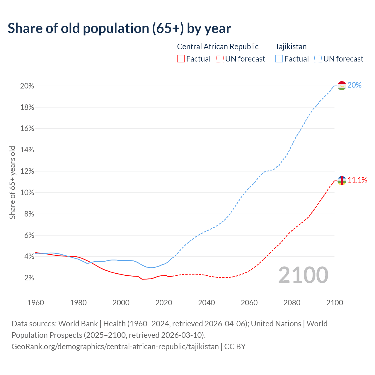 - The share of old-age demographic (65+) in the Central African Republic is 2.15% vs 3.85% in Tajikistan.
