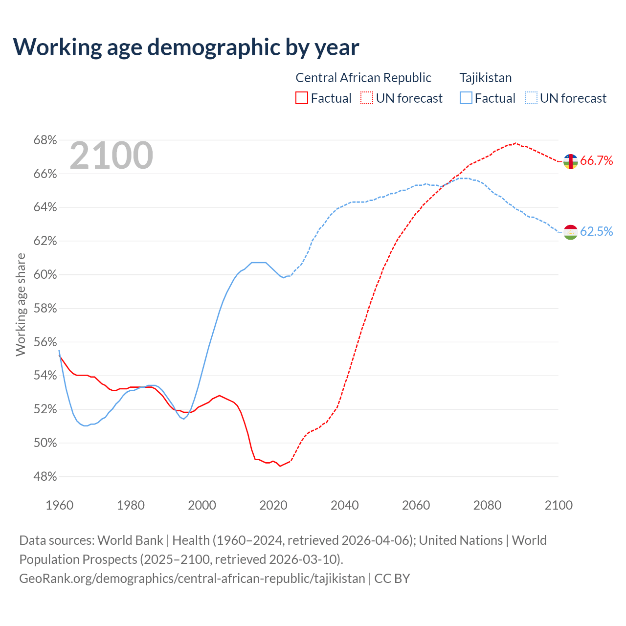 - The Central African Republic has 2.81M working age adults (aged 15-64) vs 6.61M in Tajikistan.