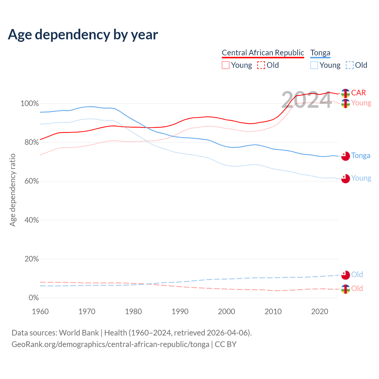 - The share of old-age demographic (65+) in the Central African Republic is 2.15% vs 6.72% in Tonga.