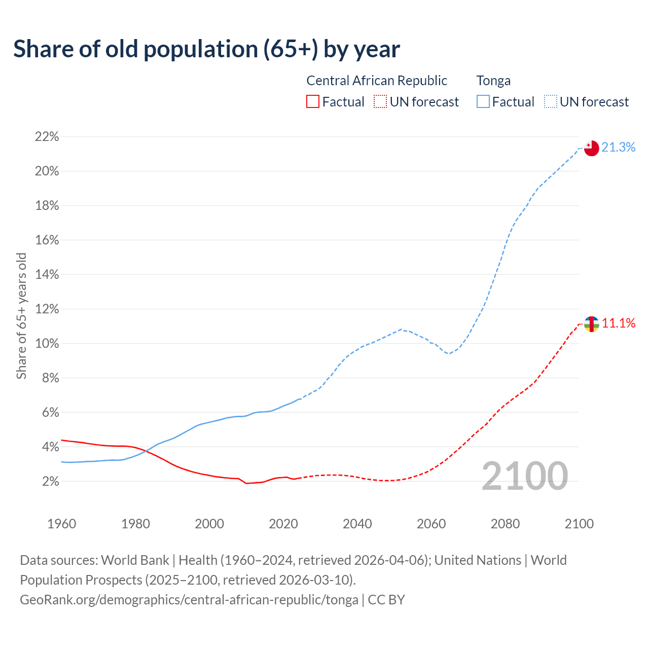 The share of older people aged 65 and over is 2.15% in the Central African Republic and 6.72% in Tonga. Life expectancy in the Central African Republic compared to Tonga .
