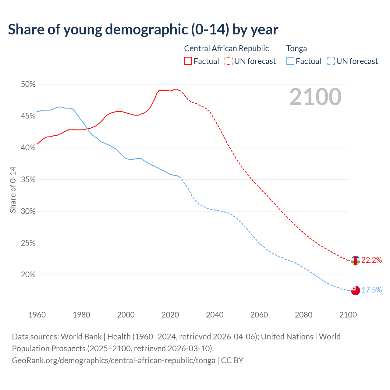 Median age Central African Republic vs Tonga, 1960-2100