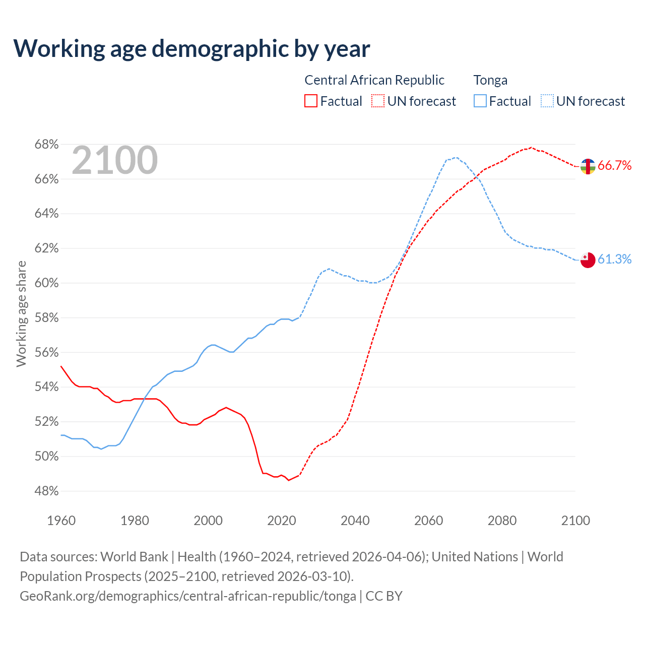 - The Central African Republic has 2.81M working age adults (aged 15-64) vs 59.8K in Tonga.