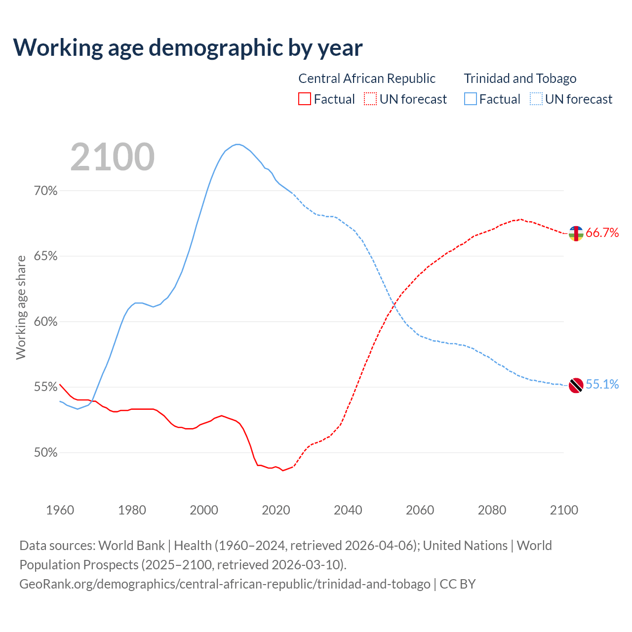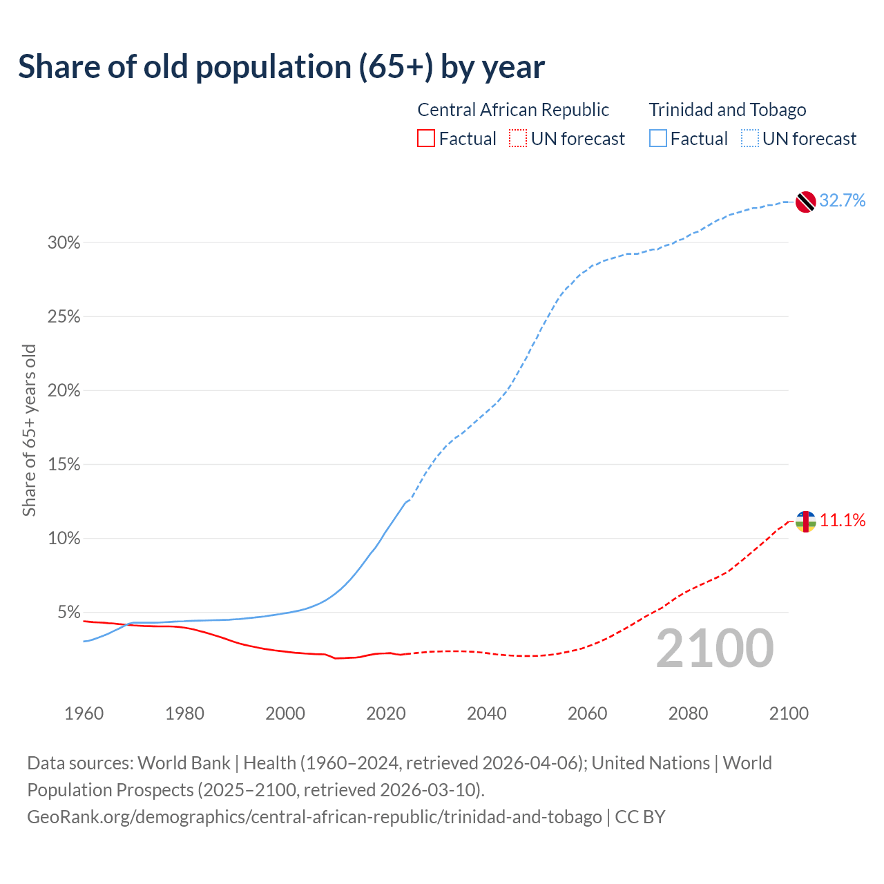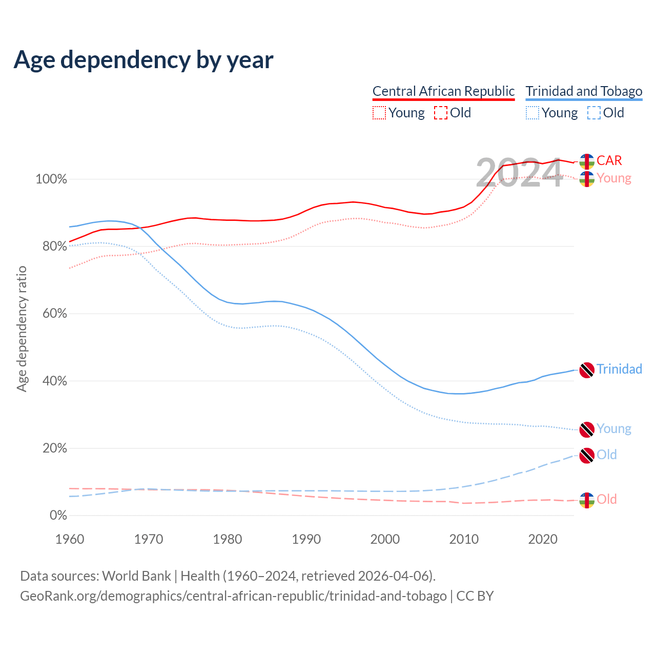 - The share of old-age demographic (65+) in the Central African Republic is 2.15% vs 12.4% in Trinidad and Tobago.