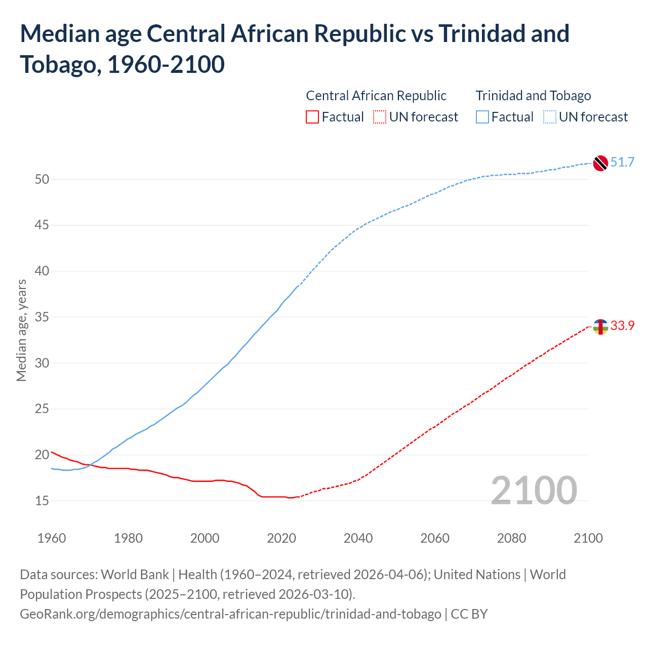 - The Central African Republic is ranked 196/196 by median age (oldest to youngest) vs 58/196 for Trinidad and Tobago.