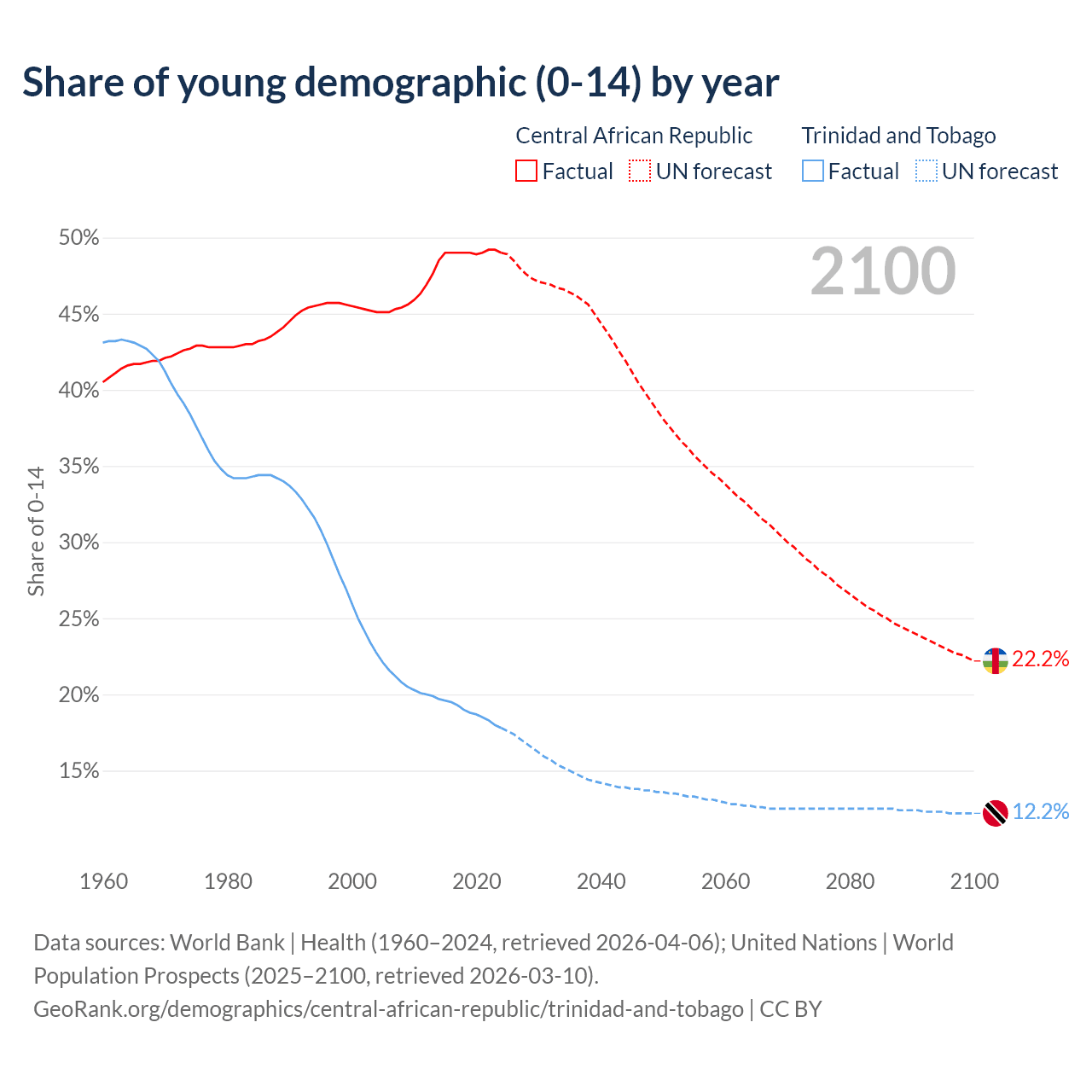 - The share of young demographic (0-15 years old) in the Central African Republic is 49% vs 17.8% in Trinidad and Tobago.