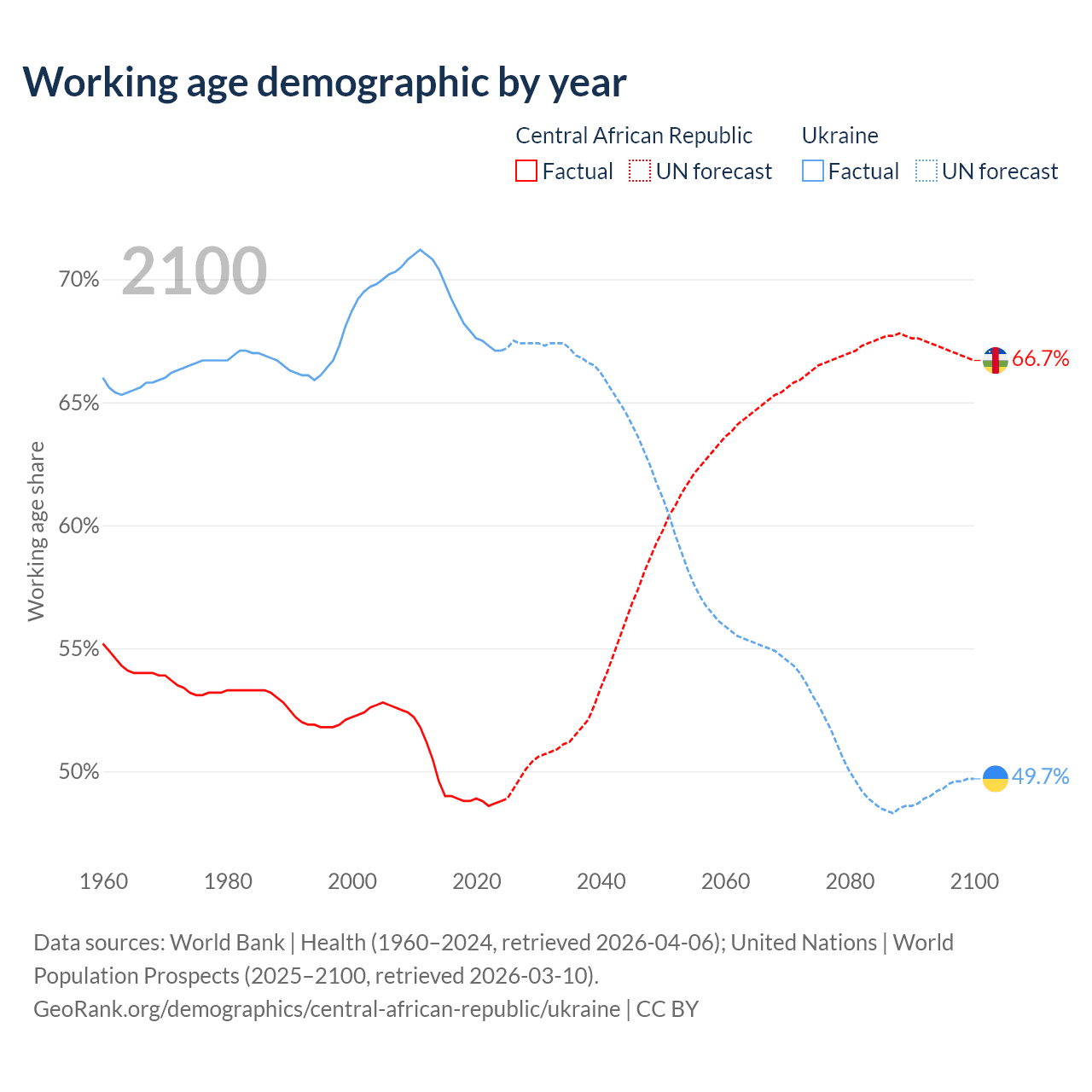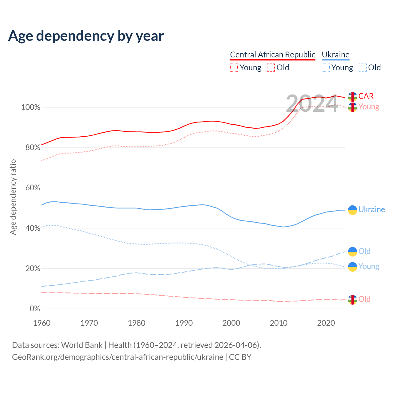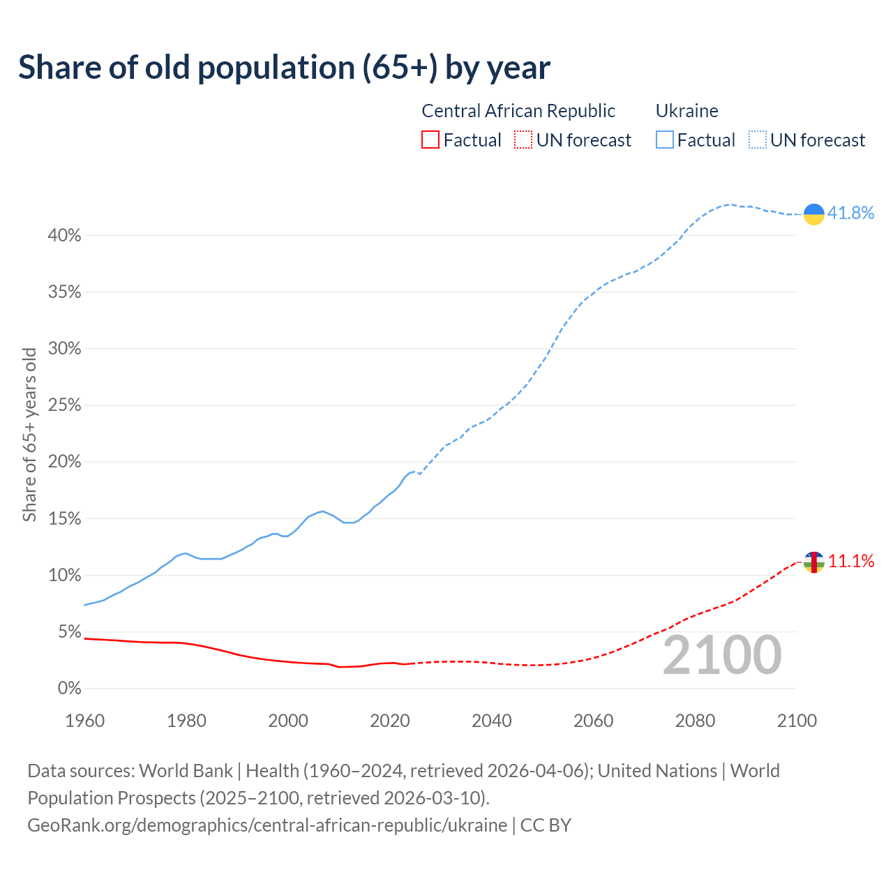 - The share of old-age demographic (65+) in the Central African Republic is 2.15% vs 19% in Ukraine.