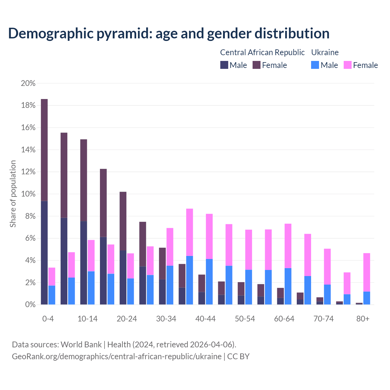 - The Central African Republic is ranked 196/196 by median age (oldest to youngest) vs 26/196 for Ukraine.