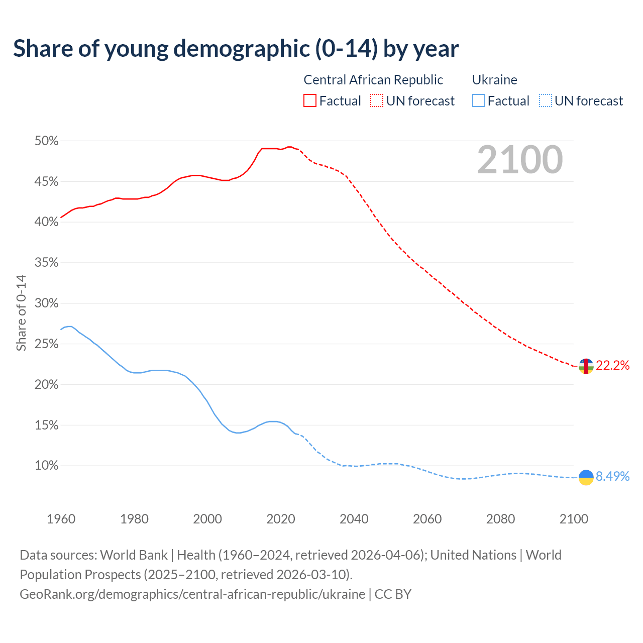 - The share of young demographic (0-15 years old) in the Central African Republic is 49% vs 13.9% in Ukraine.