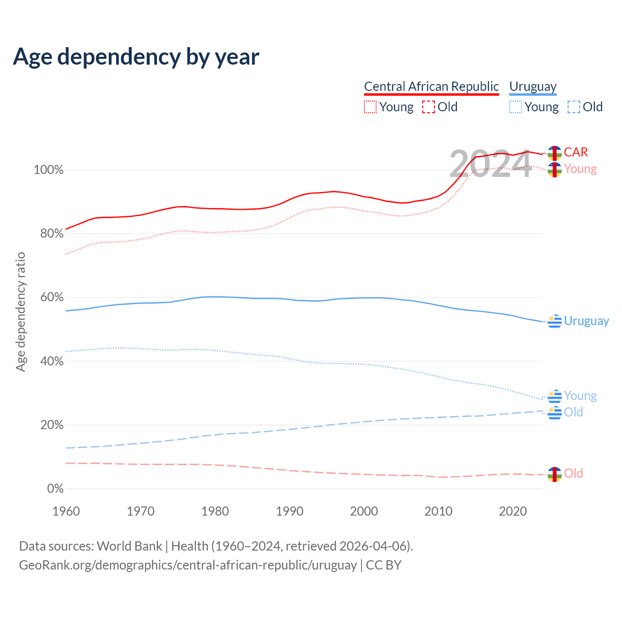 - The Central African Republic is ranked 196/196 by median age (oldest to youngest) vs 63/196 for Uruguay.