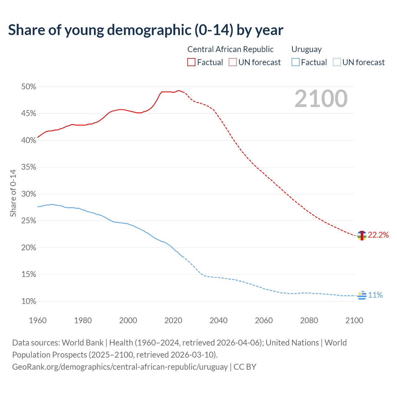 - The share of young demographic (0-15 years old) in the Central African Republic is 49% vs 18.3% in Uruguay.
