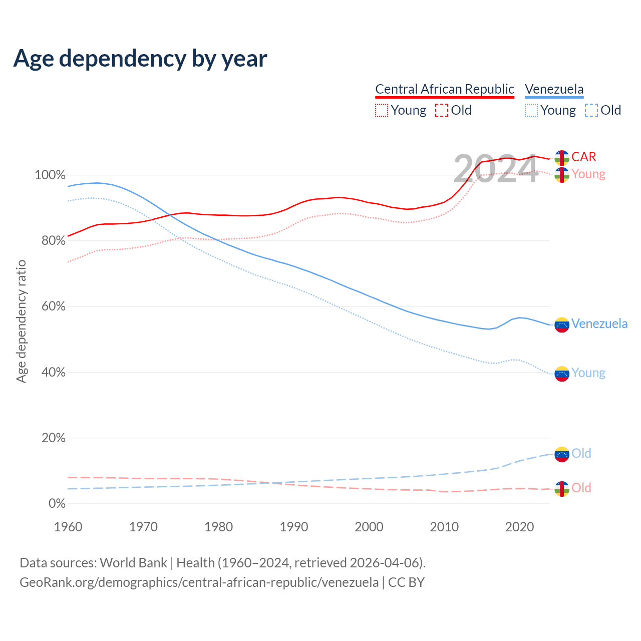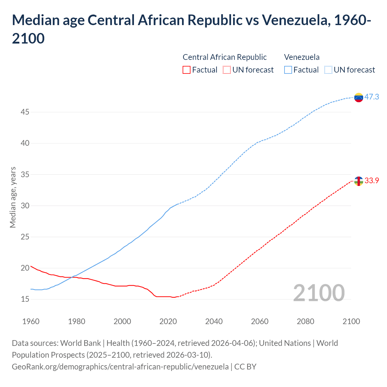 - The Central African Republic is ranked 196/196 by median age (oldest to youngest) vs 104/196 for Venezuela.
