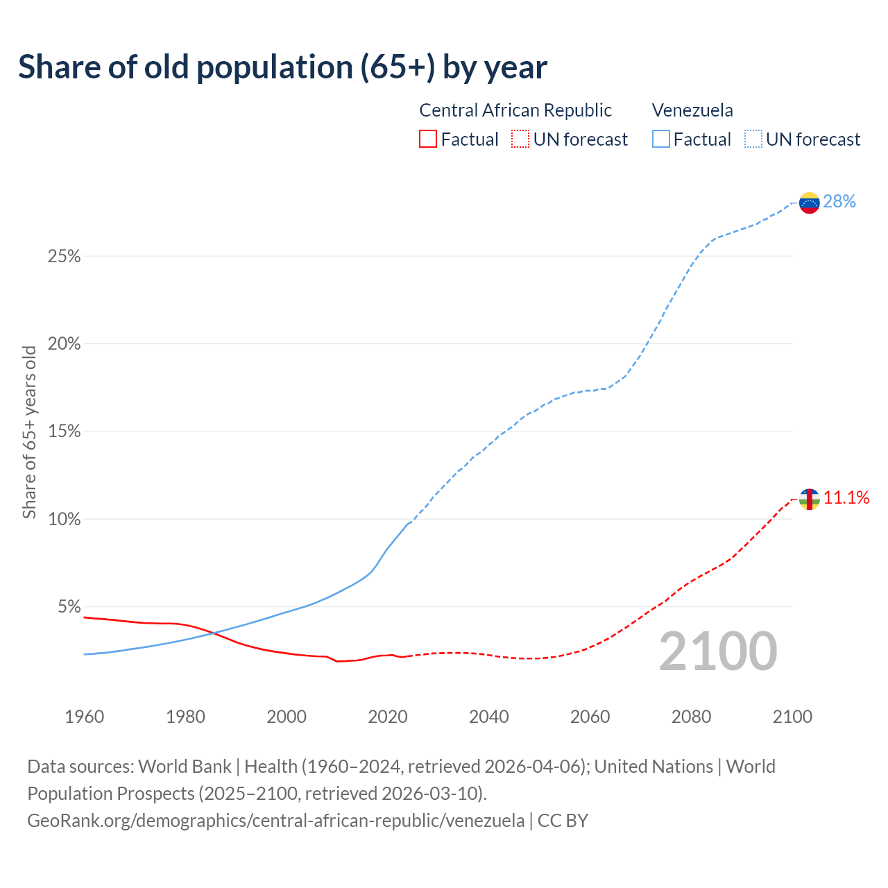 The share of older people aged 65 and over is 2.15% in the Central African Republic and 9.68% in Venezuela. Life expectancy in the Central African Republic compared to Venezuela .