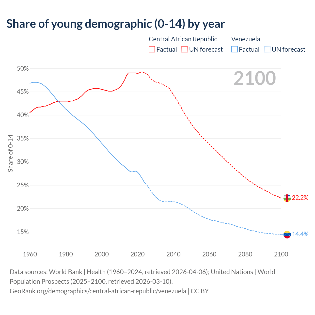 - The share of young demographic (0-15 years old) in the Central African Republic is 49% vs 25.5% in Venezuela.