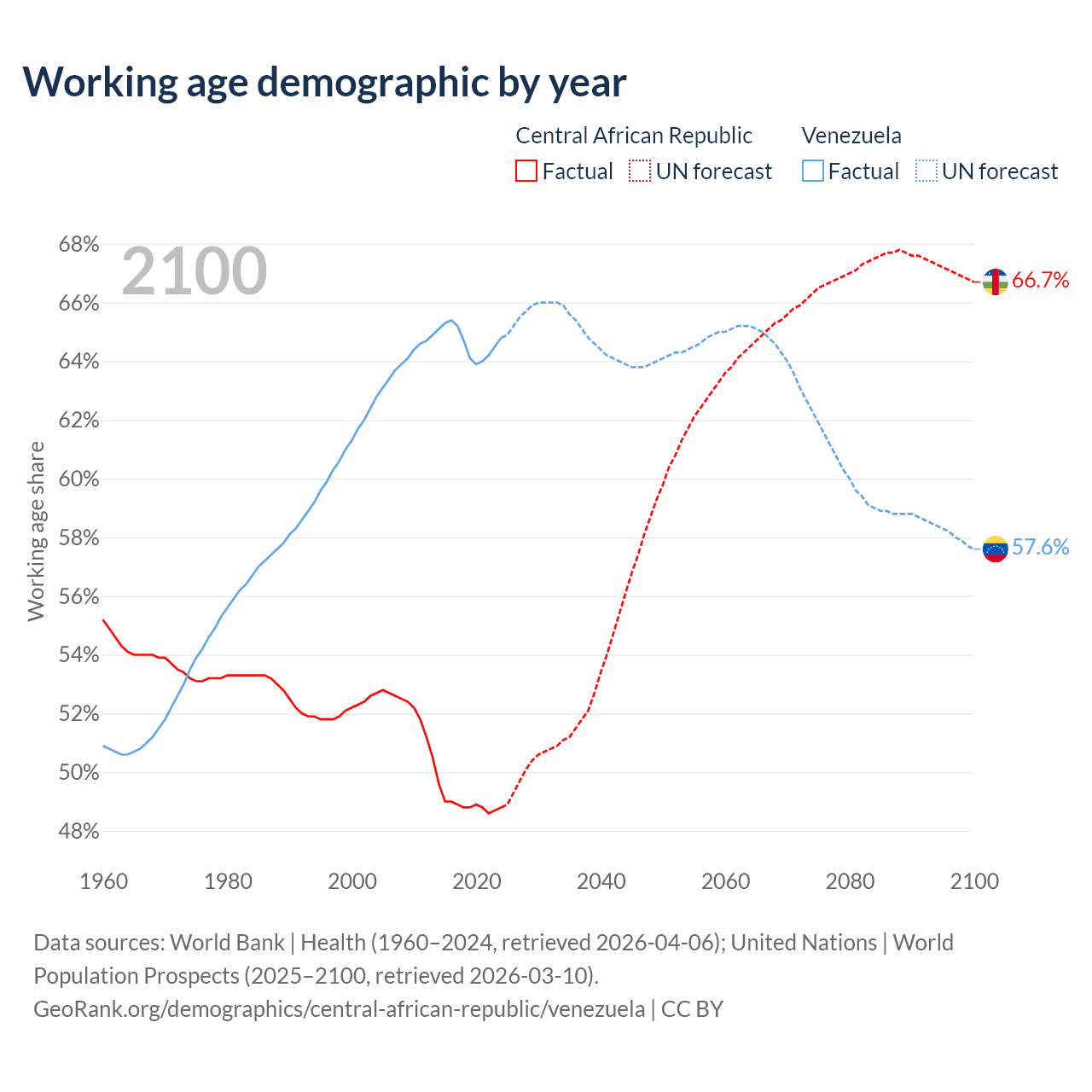 - The Central African Republic has 2.81M working age adults (aged 15-64) vs 18.6M in Venezuela.