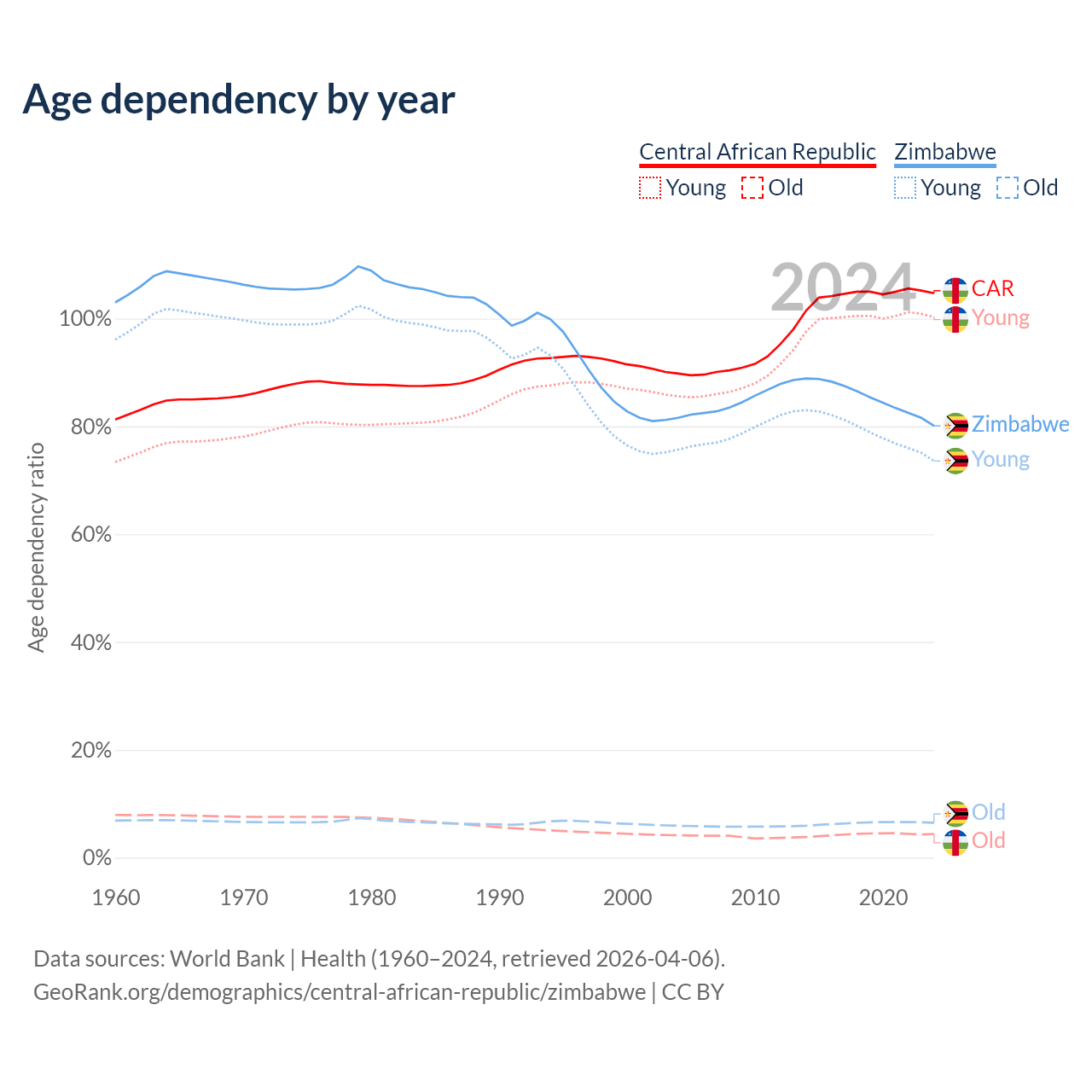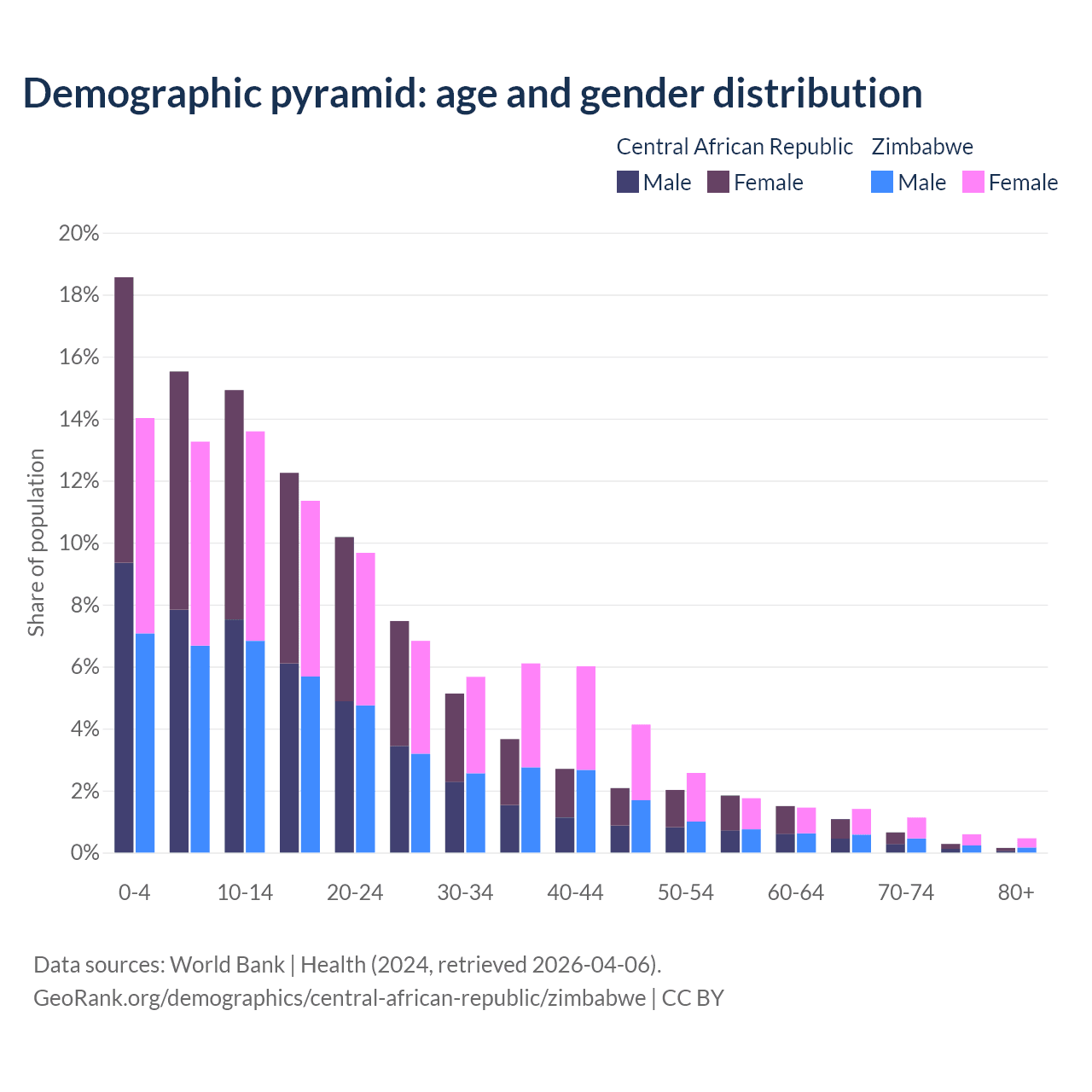 - The Central African Republic is ranked 196/196 by median age (oldest to youngest) vs 177/196 for Zimbabwe.