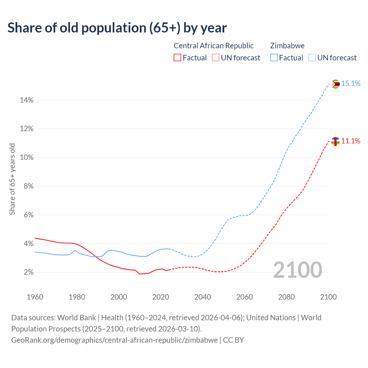 The share of older people aged 65 and over is 2.15% in the Central African Republic and 3.6% in Zimbabwe. Life expectancy in the Central African Republic compared to Zimbabwe .