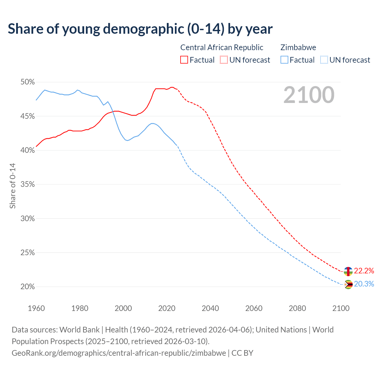 - The share of young demographic (0-15 years old) in the Central African Republic is 49% vs 40.9% in Zimbabwe.