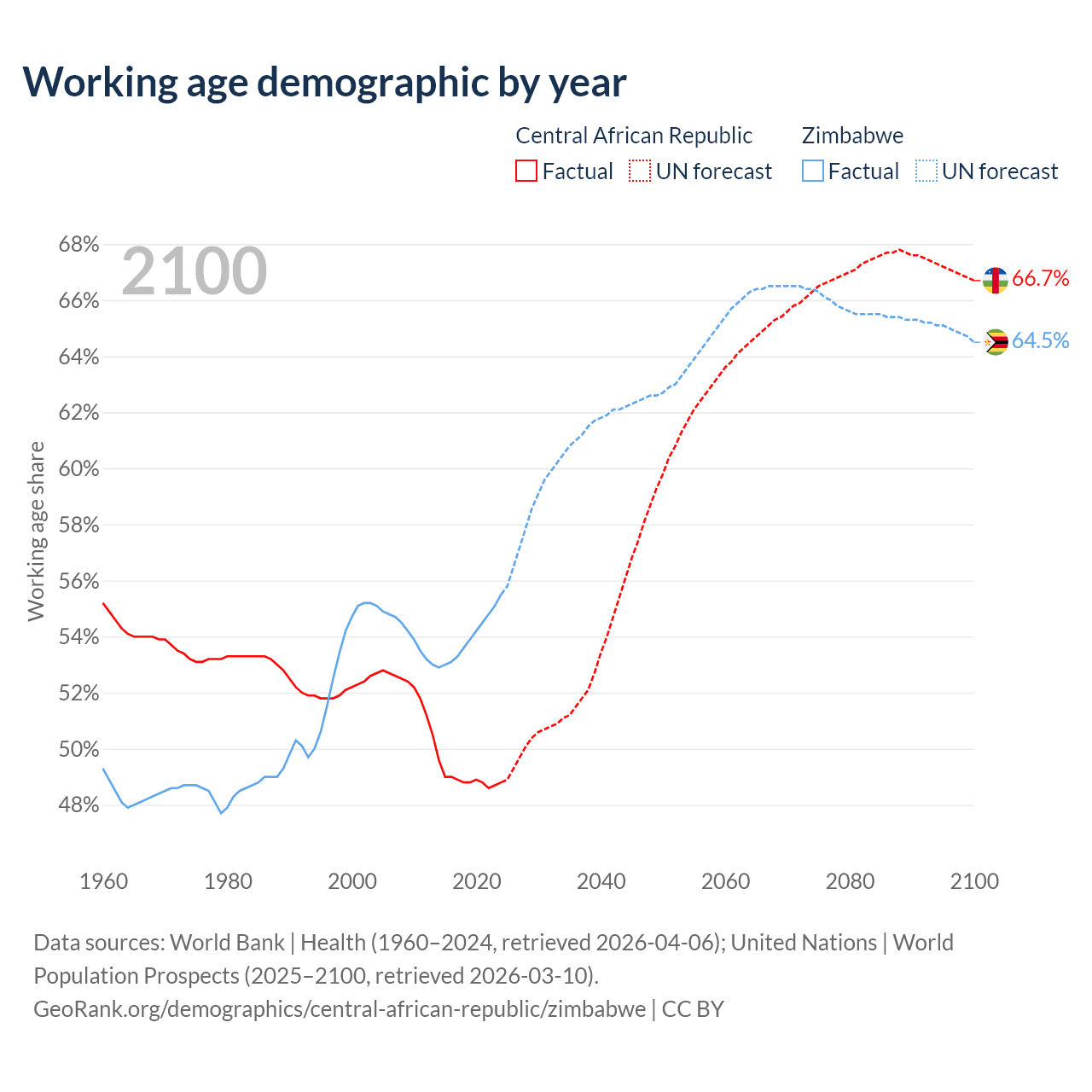 - The Central African Republic has 2.81M working age adults (aged 15-64) vs 9.64M in Zimbabwe.