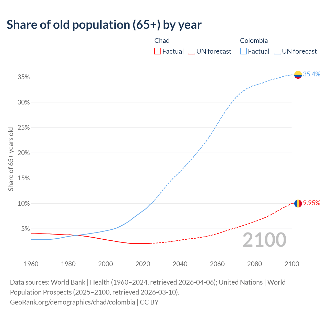 The share of older people aged 65 and over is 2.1% in Chad and 9.78% in Colombia. Life expectancy in Chad compared to Colombia .