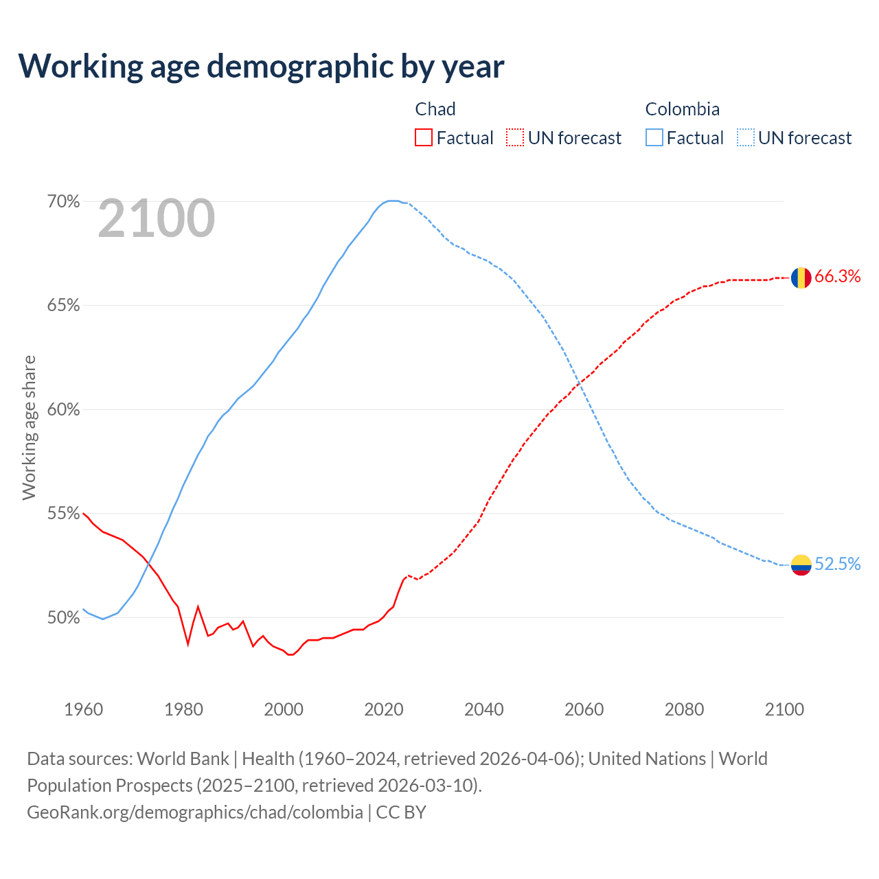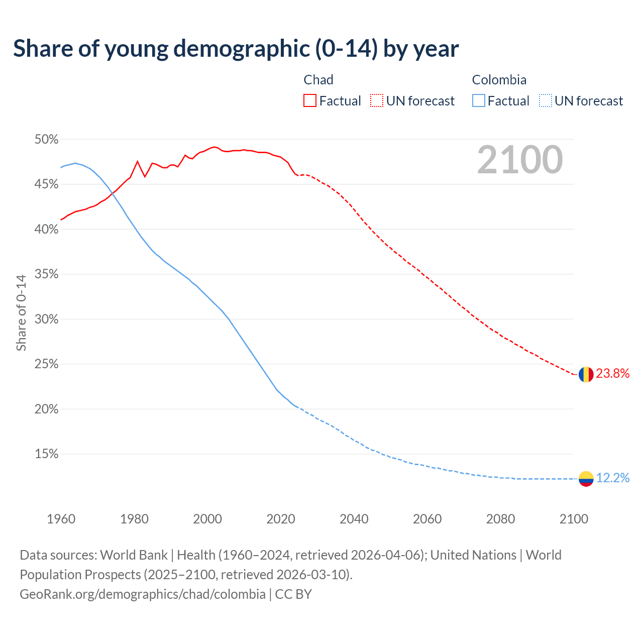 - The share of young demographic (0-15 years old) in Chad is 46.1% vs 20.3% in Colombia.