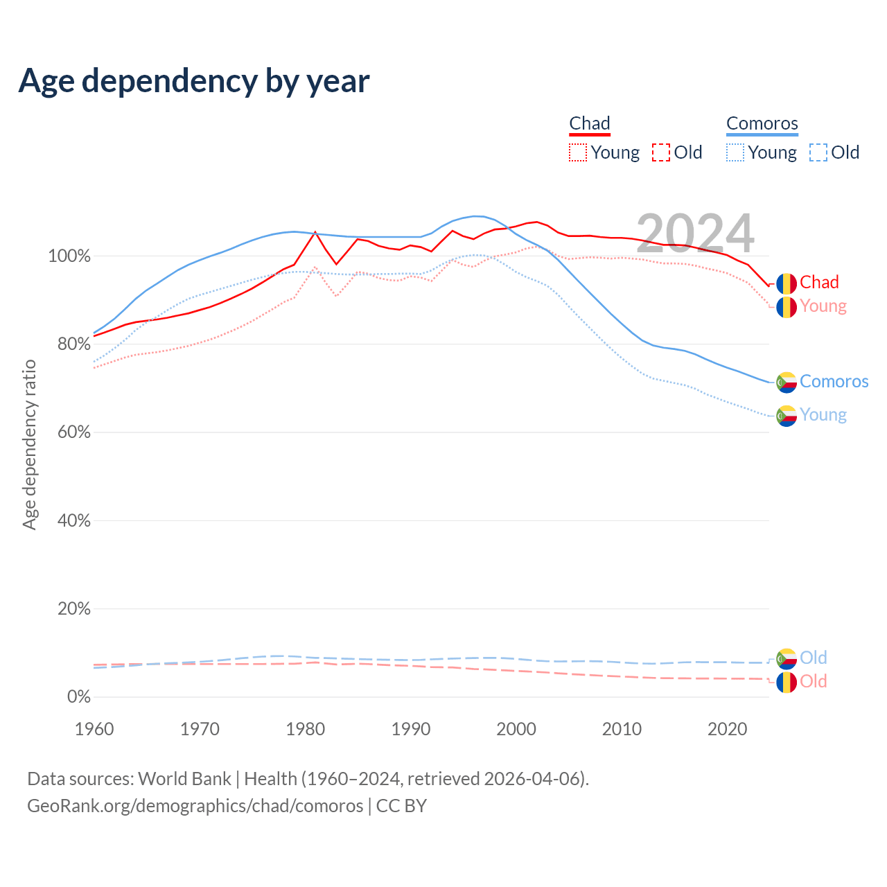 - Chad is ranked 192/196 by median age (oldest to youngest) vs 152/196 for Comoros.
