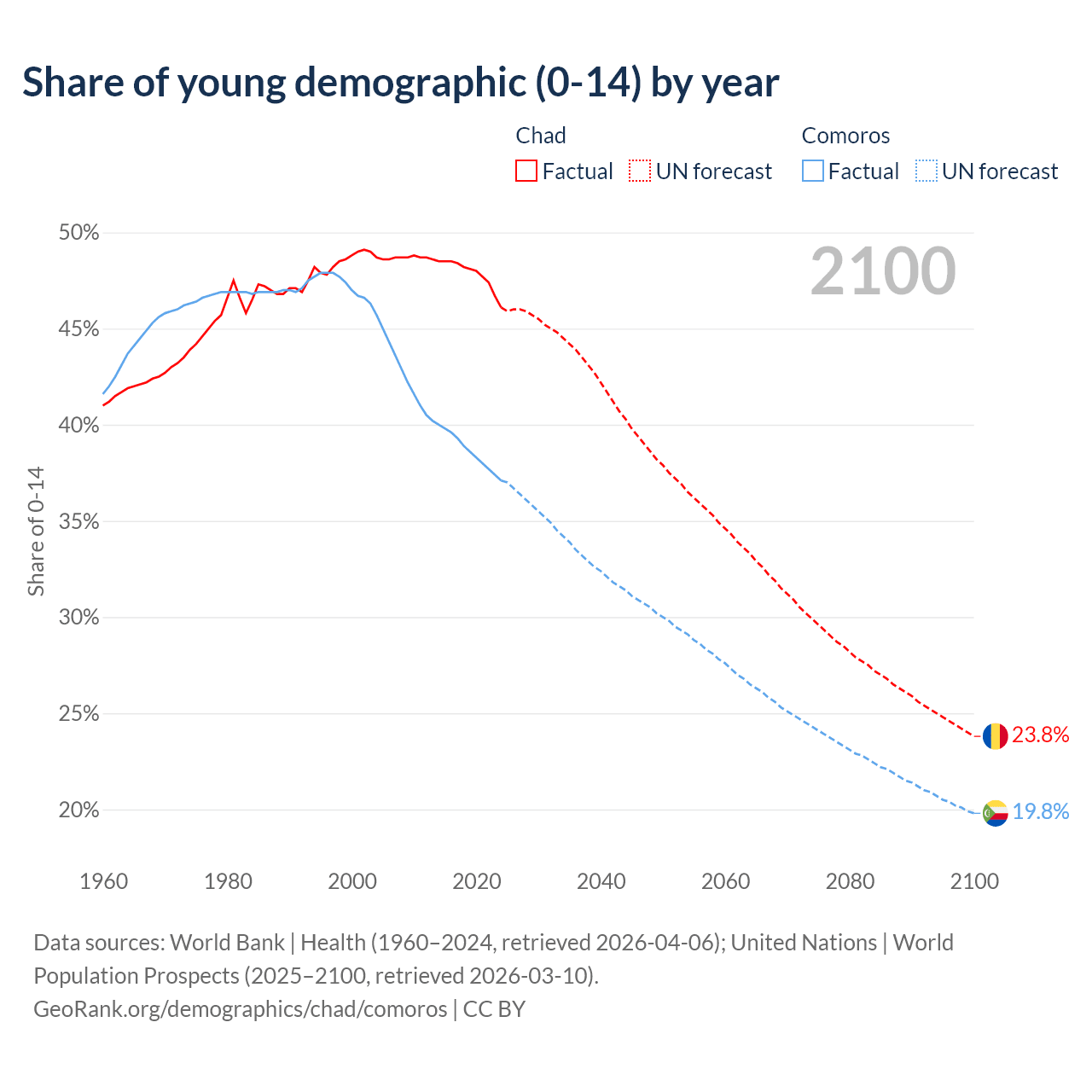 - The share of young demographic (0-15 years old) in Chad is 46.1% vs 37.1% in Comoros.