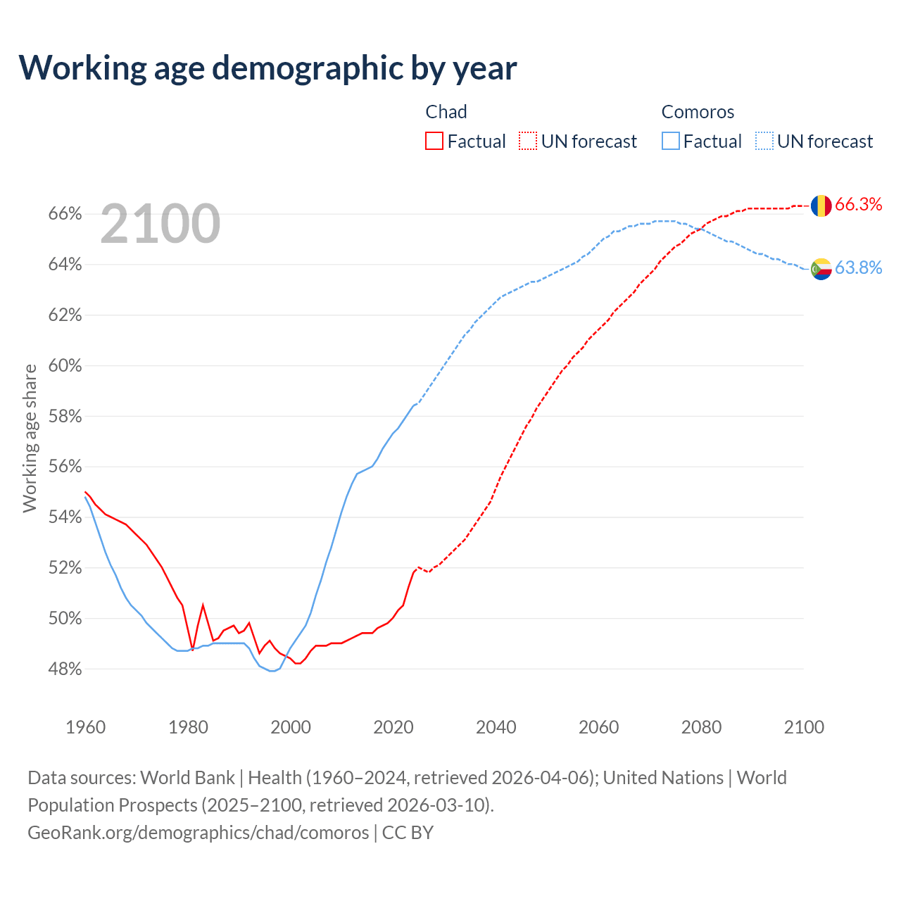 The share of older people aged 65 and over is 2.1% in Chad and 4.47% in Comoros. Life expectancy in Chad compared to Comoros .