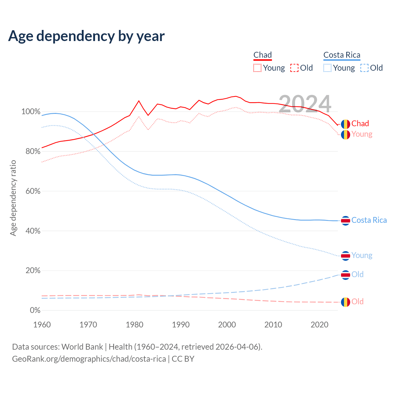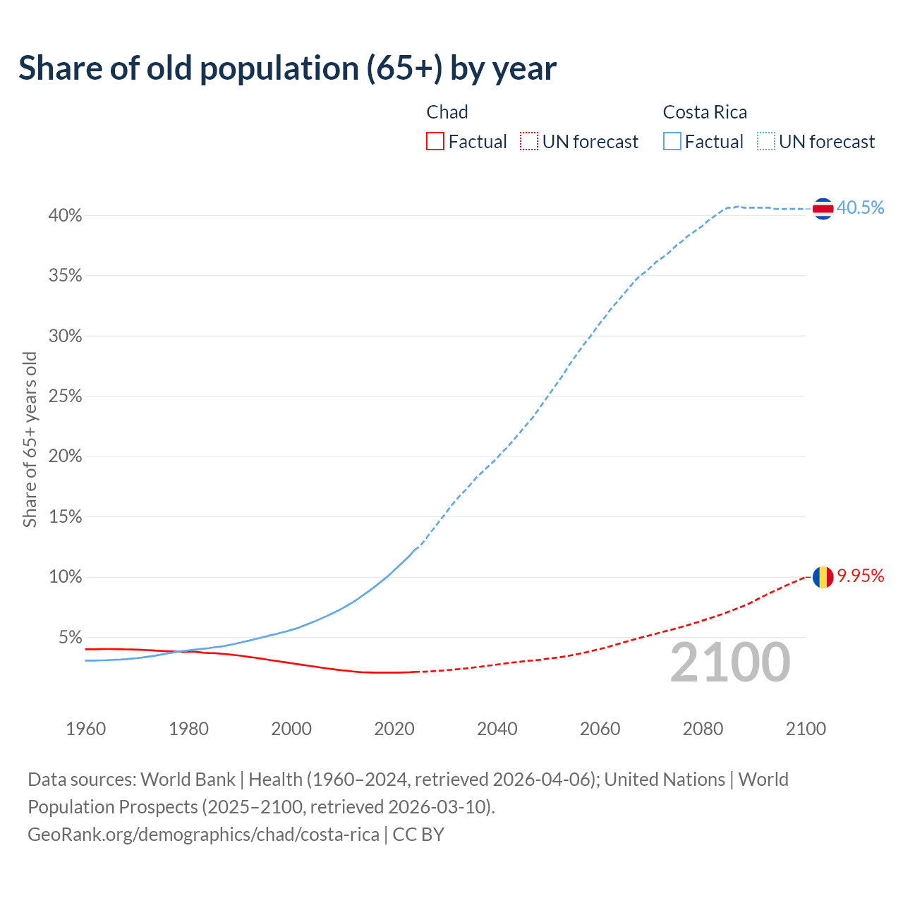 - The share of old-age demographic (65+) in Chad is 2.1% vs 12.2% in Costa Rica.