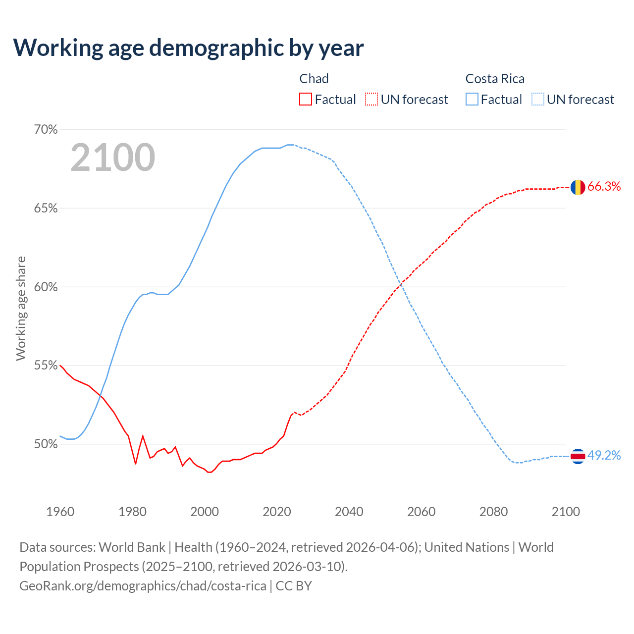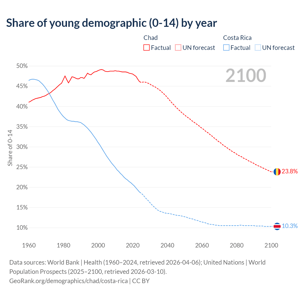 - The share of young demographic (0-15 years old) in Chad is 46.1% vs 18.8% in Costa Rica.