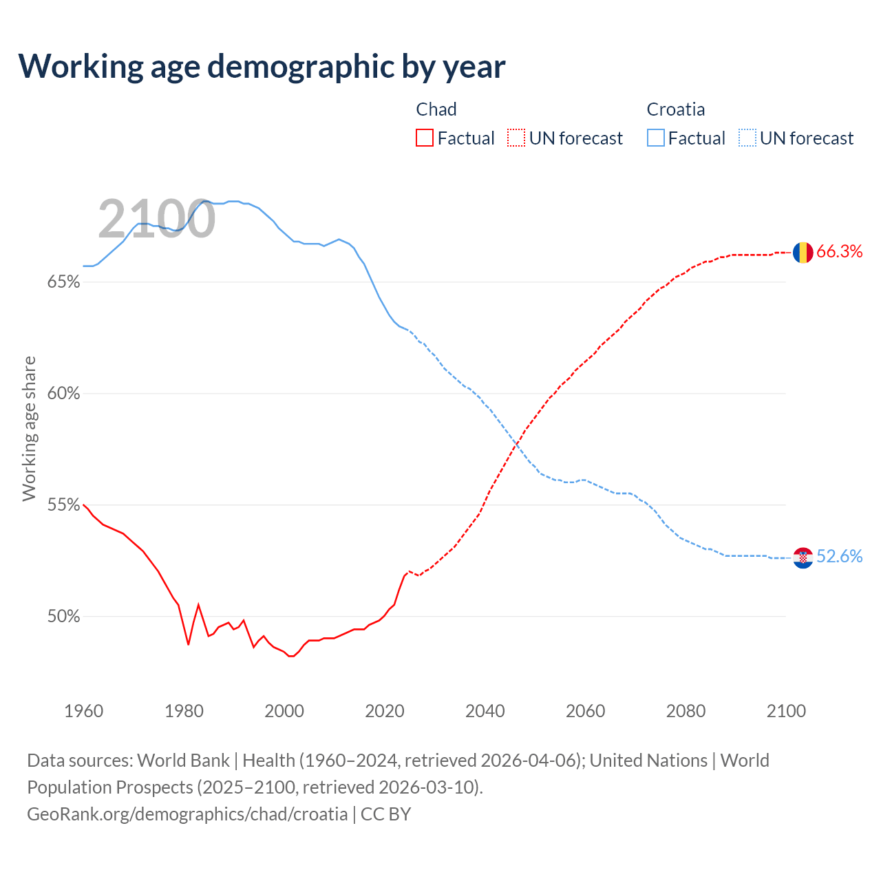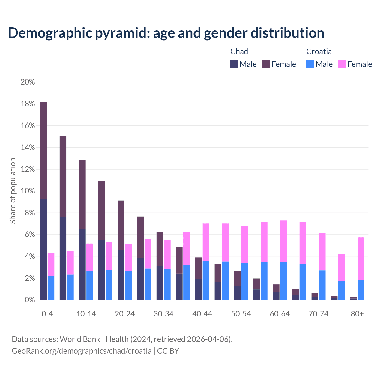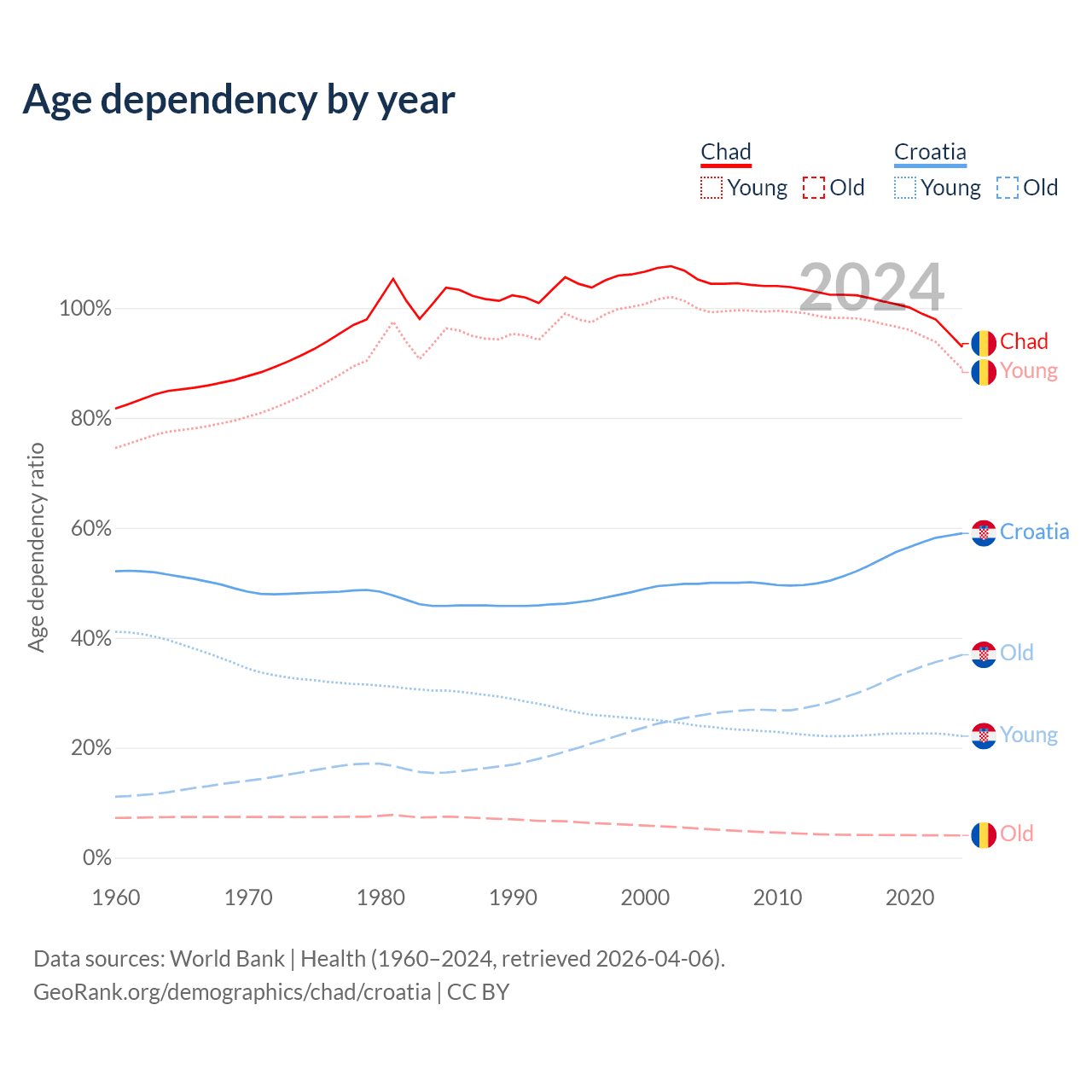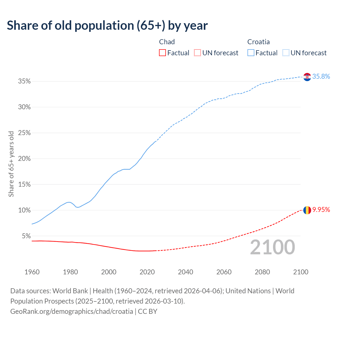 - The share of old-age demographic (65+) in Chad is 2.1% vs 23.2% in Croatia.