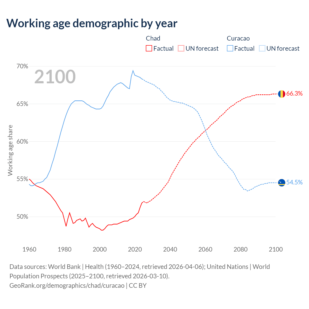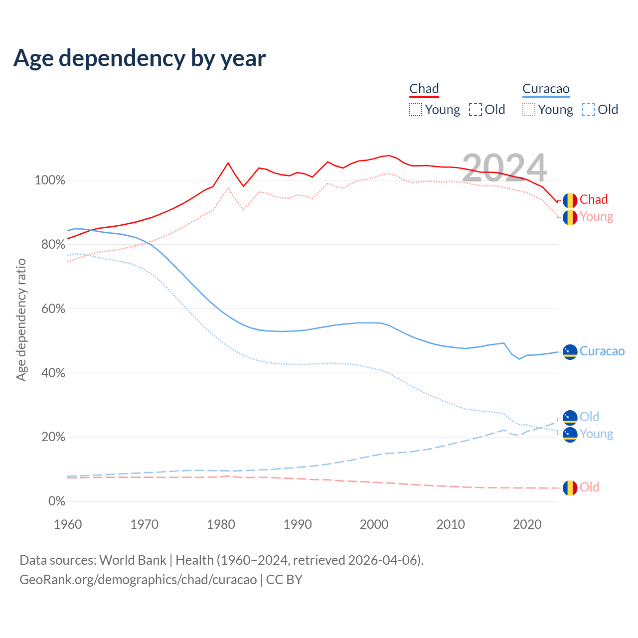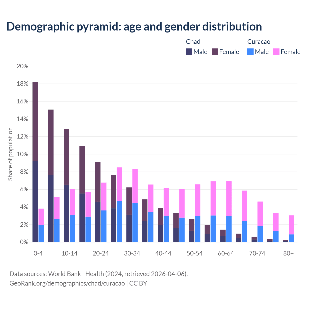 - The share of young demographic (0-15 years old) in Chad is 46.1% vs 14.9% in Curacao.