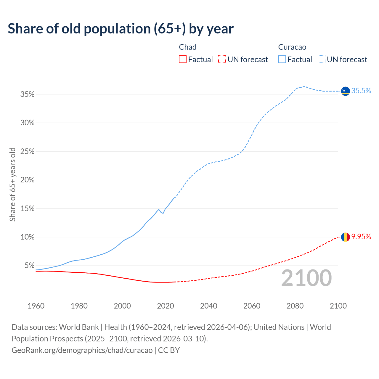 - The share of old-age demographic (65+) in Chad is 2.1% vs 16.8% in Curacao.