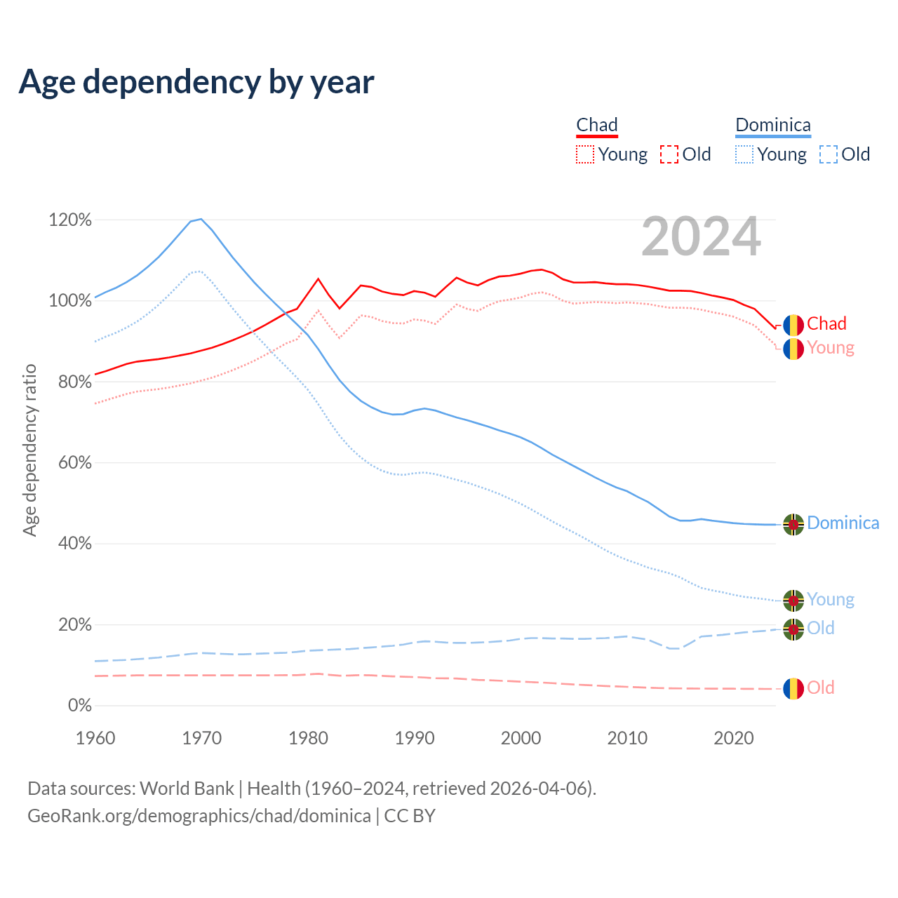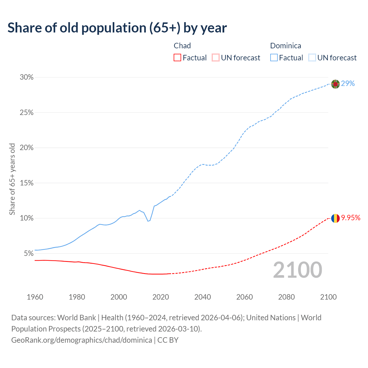 The share of older people aged 65 and over is 2.1% in Chad and 13% in Dominica. Life expectancy in Chad compared to Dominica .