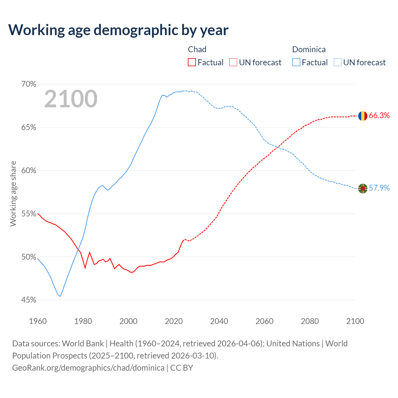- Chad has 11.3M working age adults (aged 15-64) vs 45.3K in Dominica.