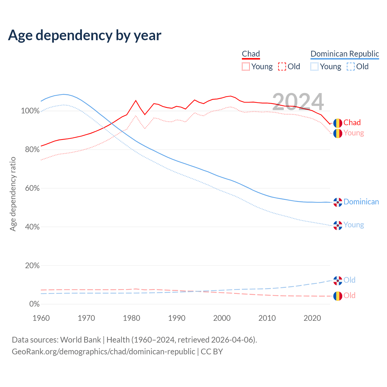 - Chad is ranked 192/196 by median age (oldest to youngest) vs 112/196 for the Dominican Republic.