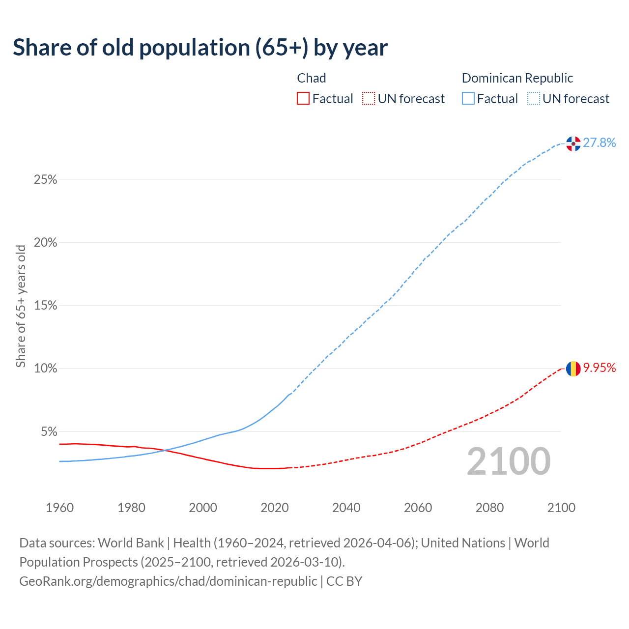 The share of older people aged 65 and over is 2.1% in Chad and 7.88% in the Dominican Republic. Life expectancy in Chad compared to the Dominican Republic .