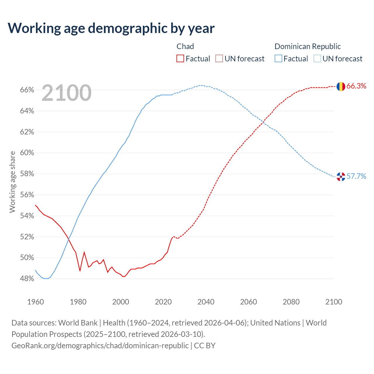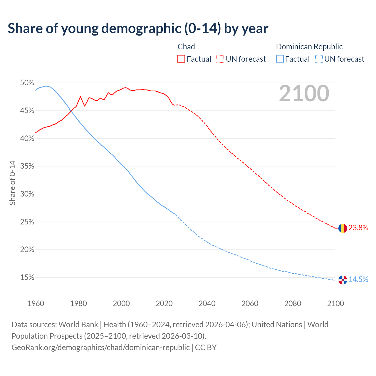 - The share of young demographic (0-15 years old) in Chad is 46.1% vs 26.6% in the Dominican Republic.