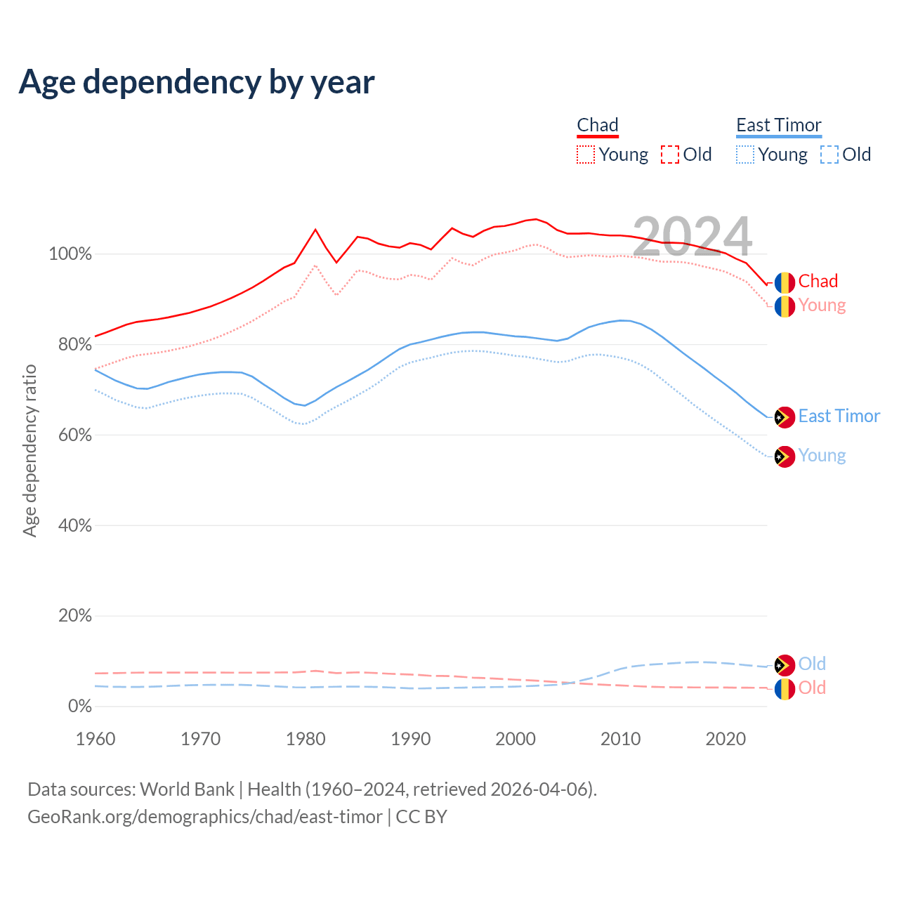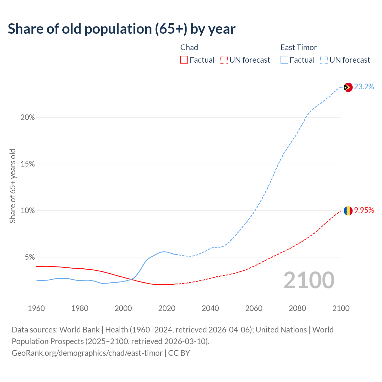 - The share of old-age demographic (65+) in Chad is 2.1% vs 5.28% in East Timor.