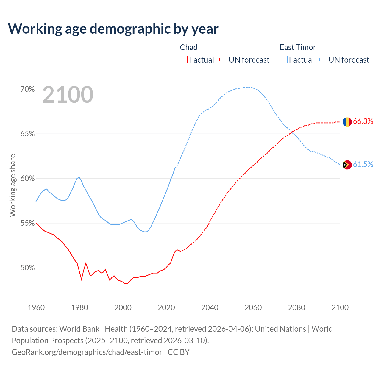 - The share of young demographic (0-15 years old) in Chad is 46.1% vs 33.7% in East Timor.