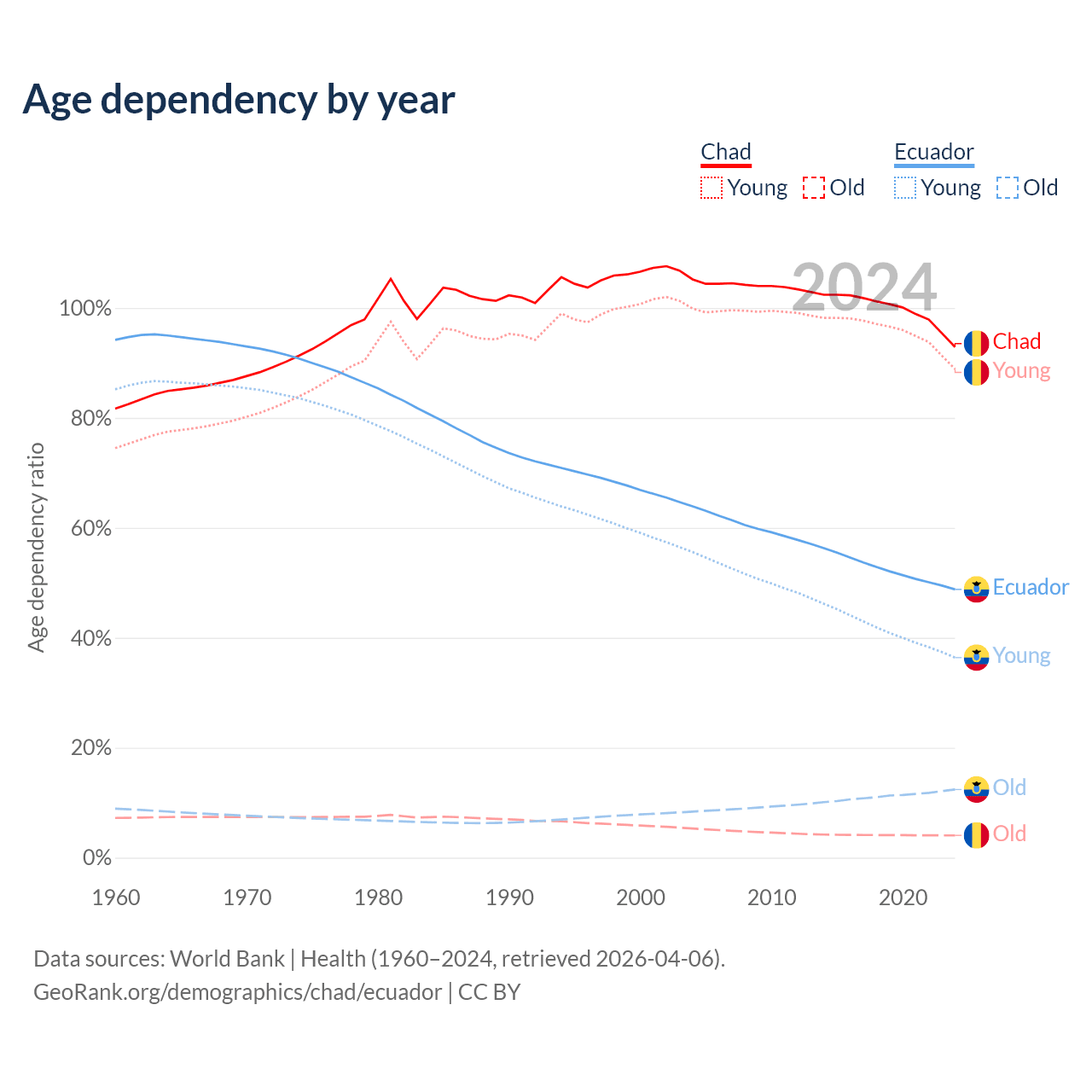 - Chad is ranked 192/196 by median age (oldest to youngest) vs 105/196 for Ecuador.