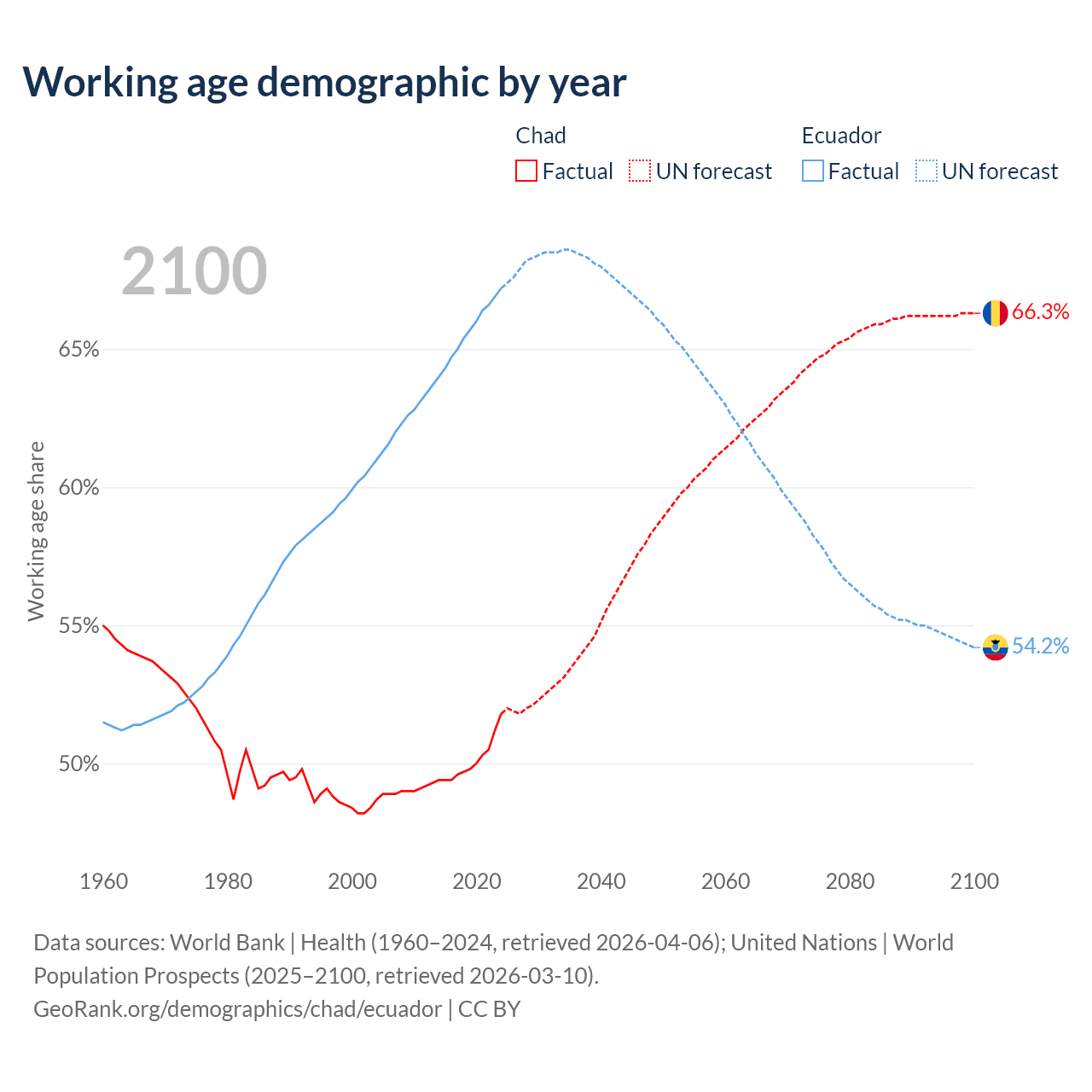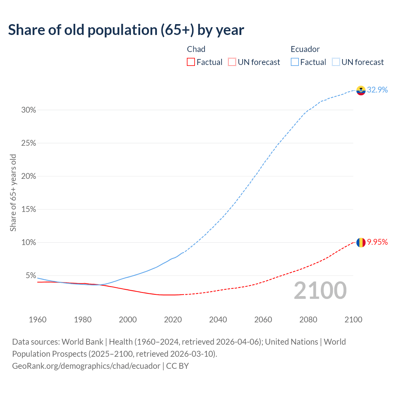 The share of older people aged 65 and over is 2.1% in Chad and 8.34% in Ecuador. Life expectancy in Chad compared to Ecuador .